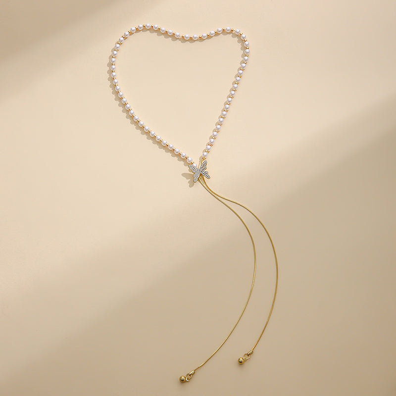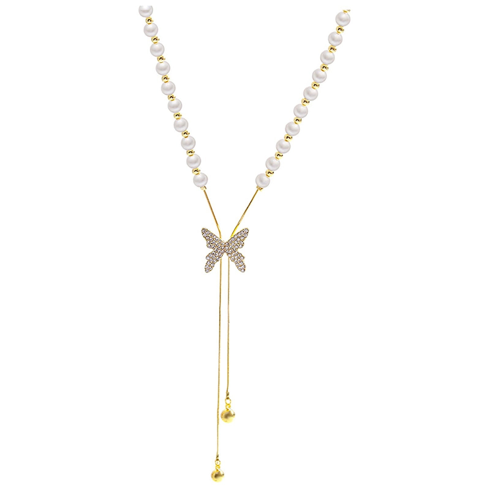Women's Gold Plated Zirconia Long Tassel Butterfly Pearl Chain Necklace