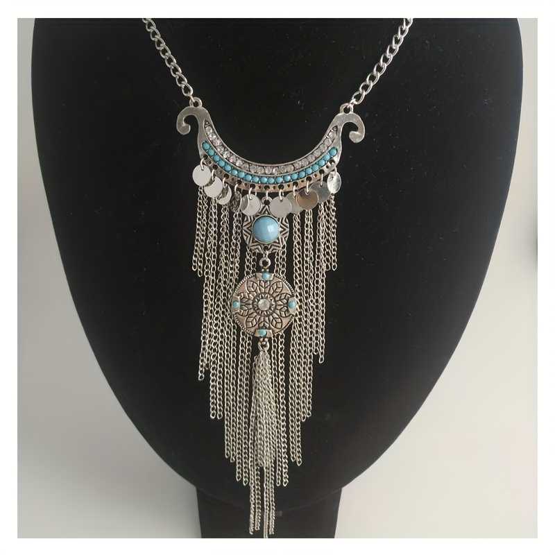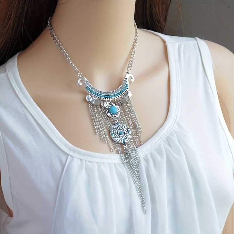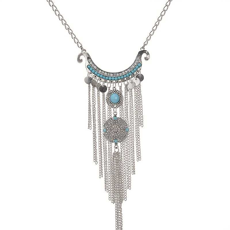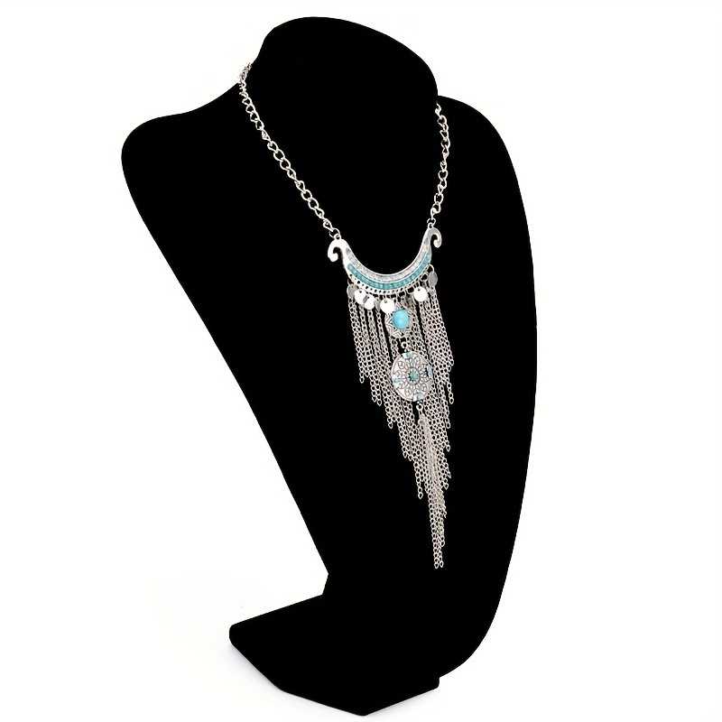 Women's Long Tassel Necklace With Oxidized Silver And Multilayer Design
