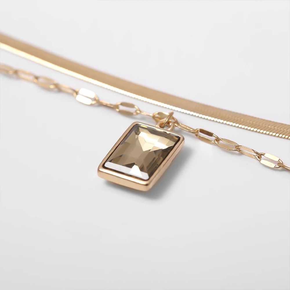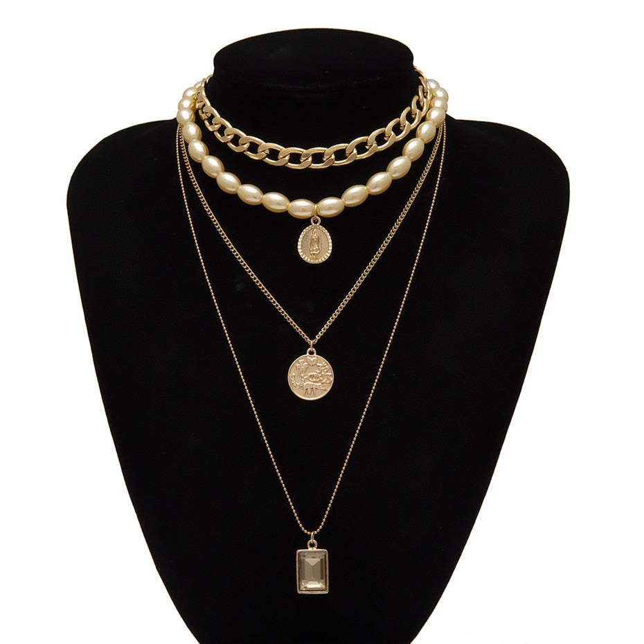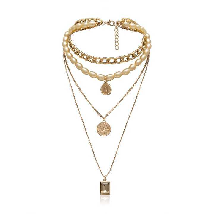 At the focal point of the necklace hangs a pendant that serves as its centerpiece. This pendant often consists of a combination of elements, including a coin charm and a crystal or gemstone accent. The coin charm adds a vintage inspired touch to the necklace, evoking images of ancient treasures and exotic locales. These coins may feature intricate designs, symbols, or engravings, adding to the necklace's charm and allure. The combination of the gold plated chains, coin charm, and crystal pendant creates a harmonious blend of elements, resulting in a necklace that is both versatile and statement making. It can be worn alone as a statement piece to elevate a simple outfit, or layered with other necklaces for a more eclectic and personalized look.