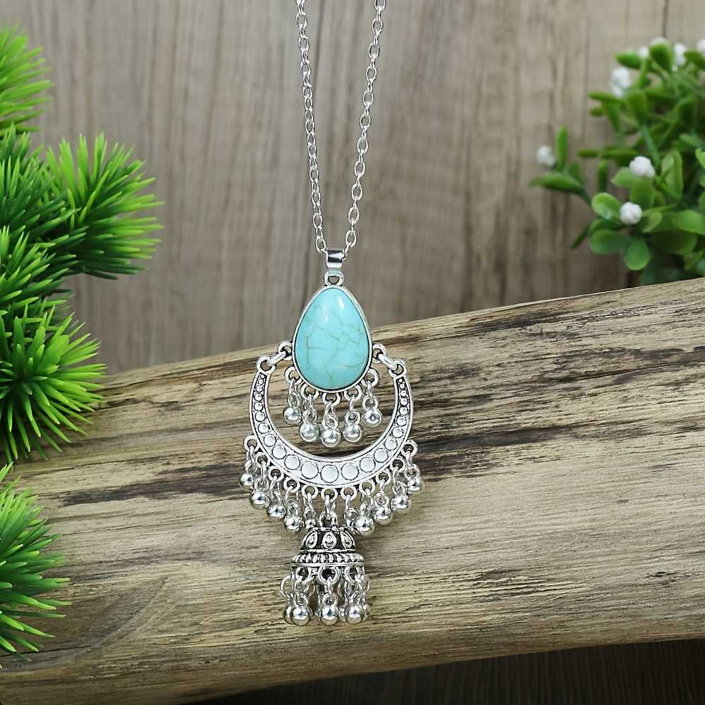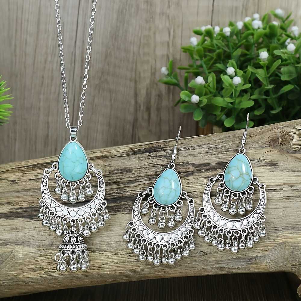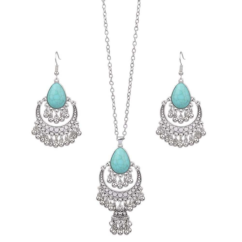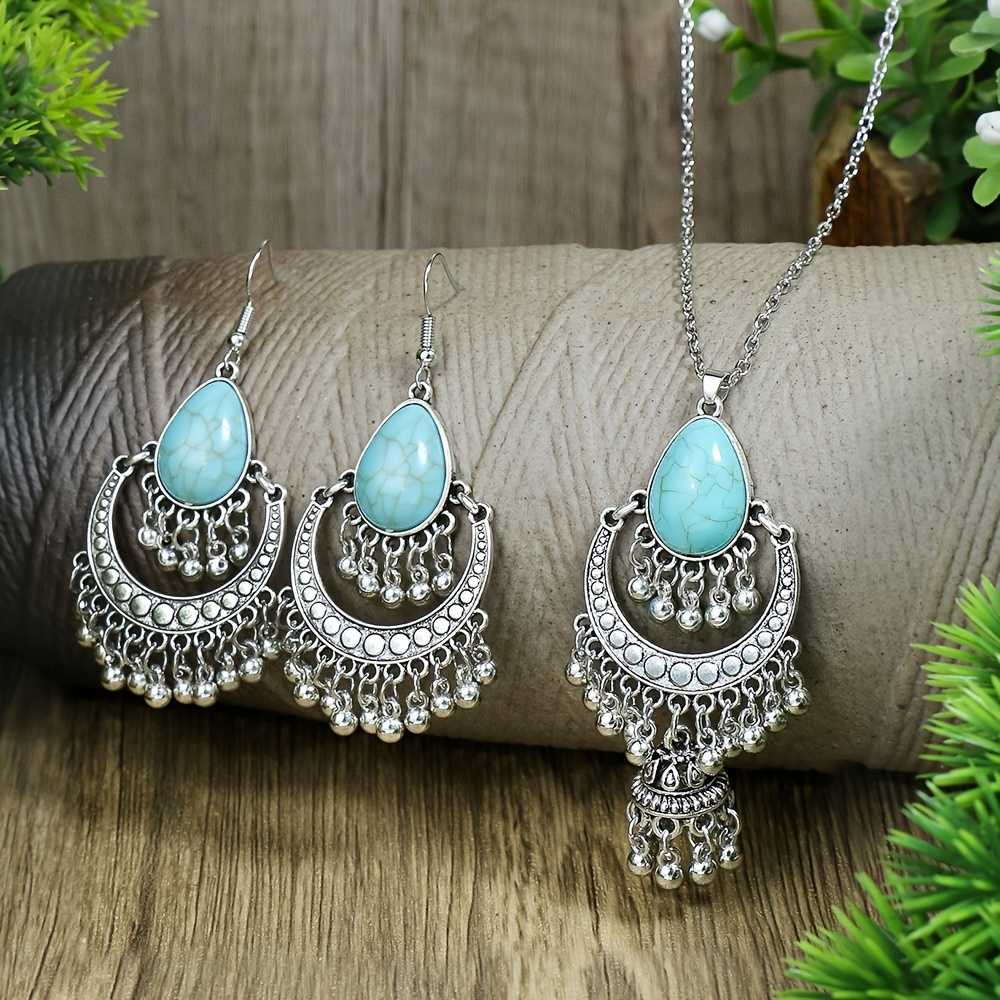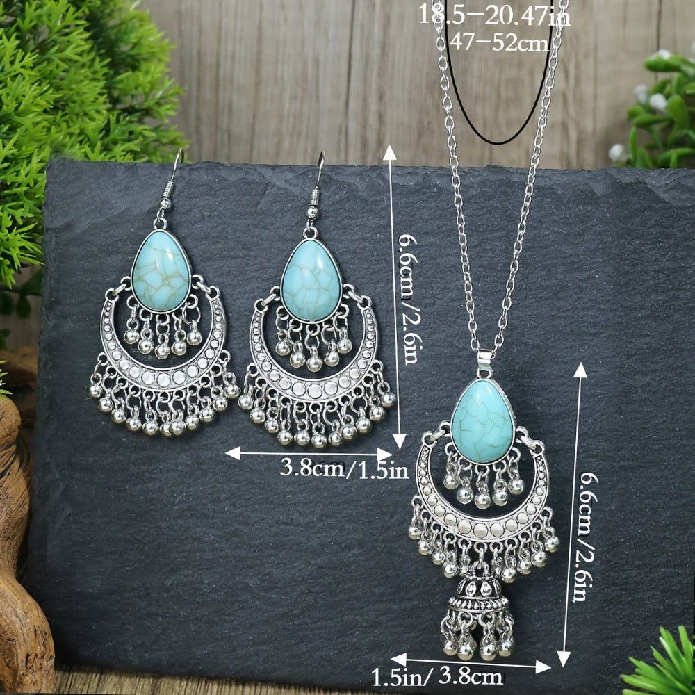 Women's Opal Earring and Necklace Jewelry Set with Tassel Beads