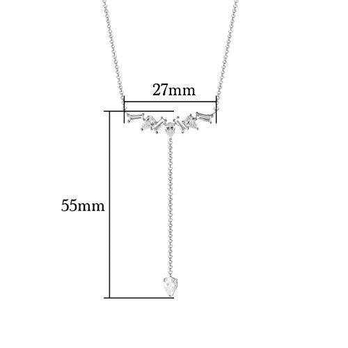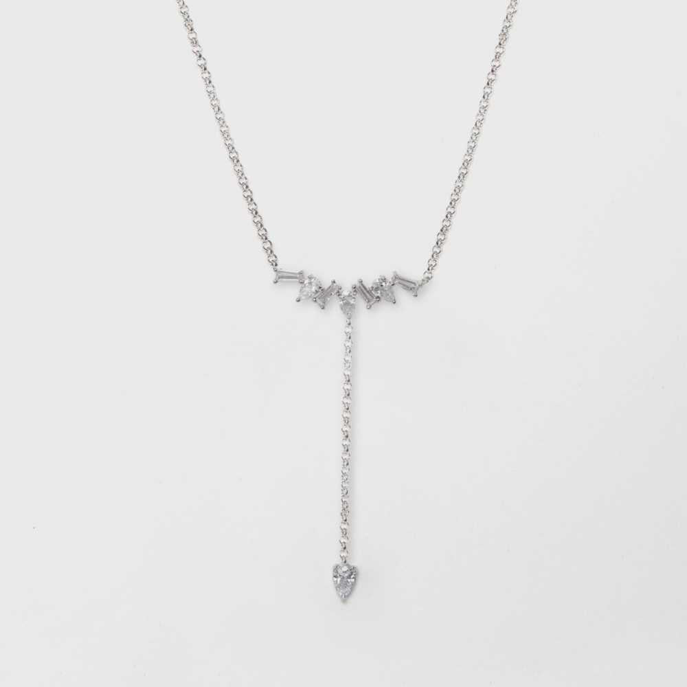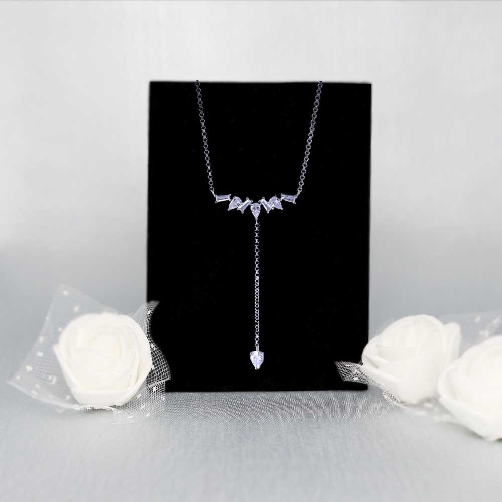 This charming silver plated pendant features dainty baguettes and symmetrically arranged pear-shaped cubic zirconia. A long chain with pear-shaped cubic zirconia drop suspends from the middle of the pendant. Surprise someone special with this modern and unique pendant necklace.