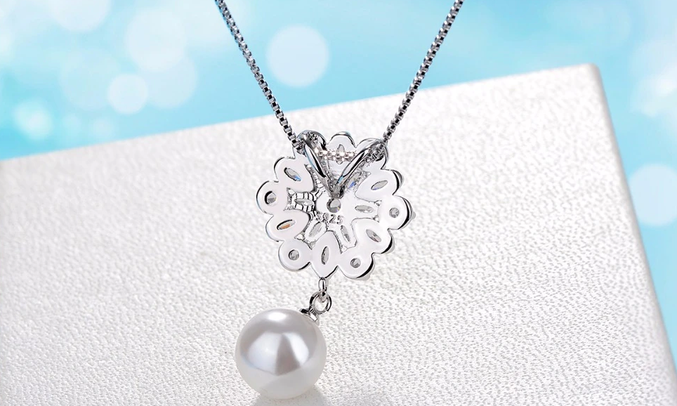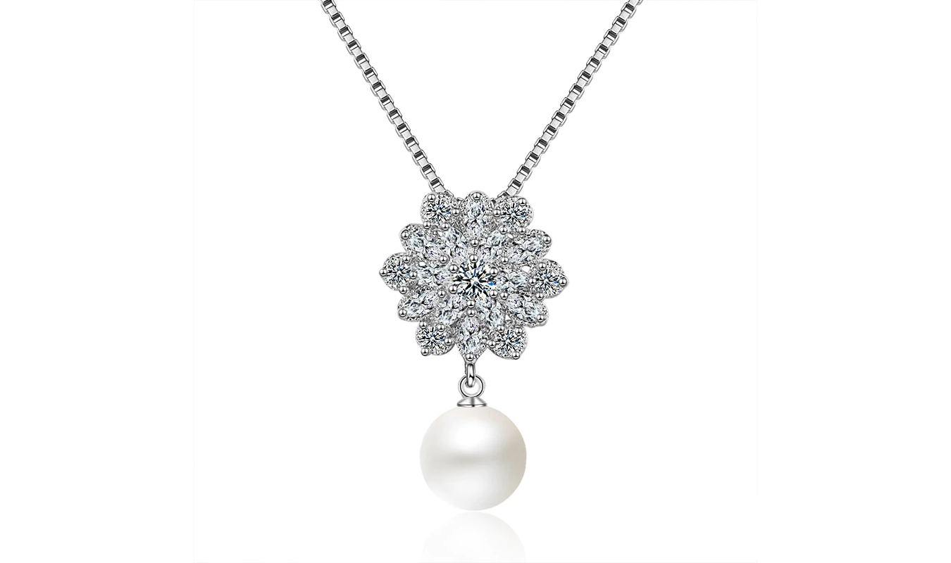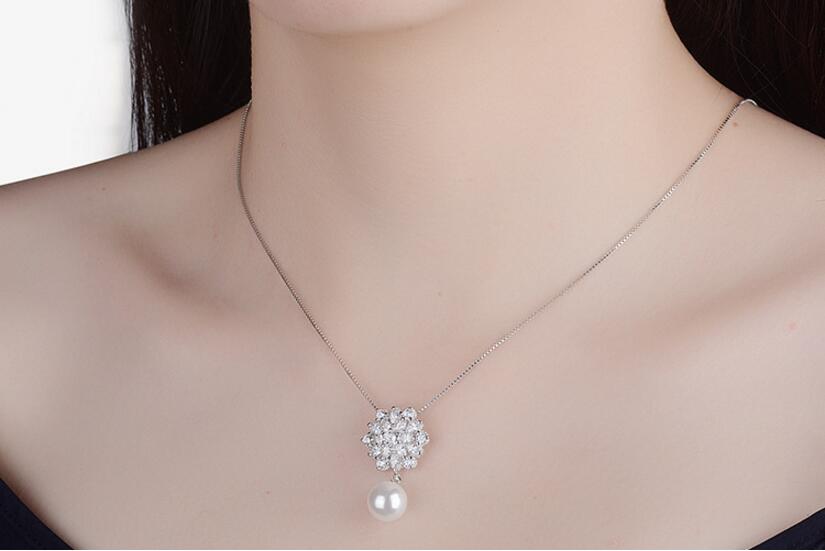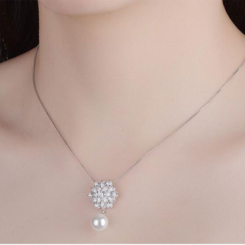 - Product Particulars: Crafted from high quality silver plated material, adorned with cubic zirconia and a lustrous pearl drop. The pendant comes with a box chain necklace and secured with a sturdy lobster clasp.