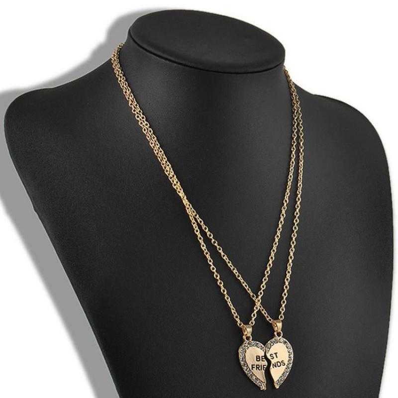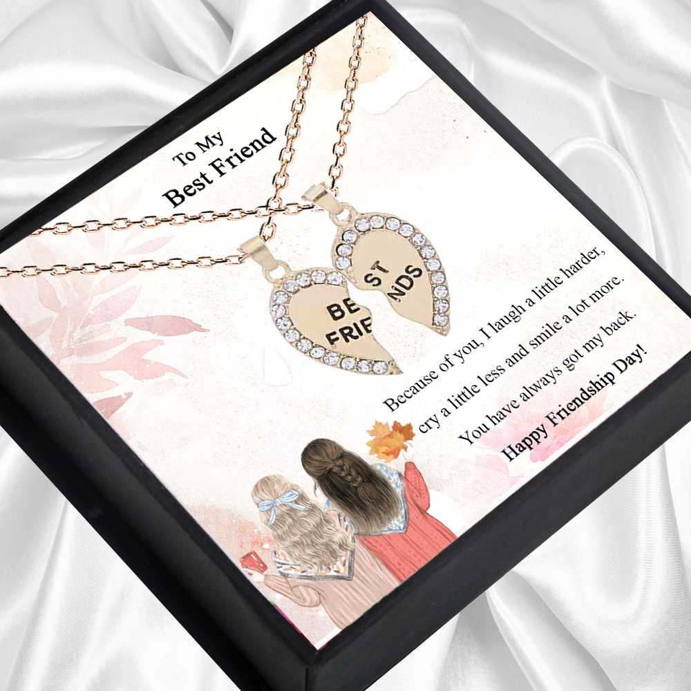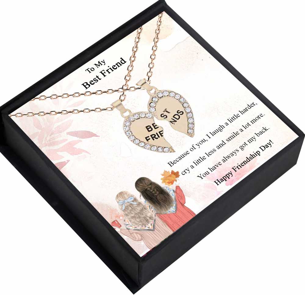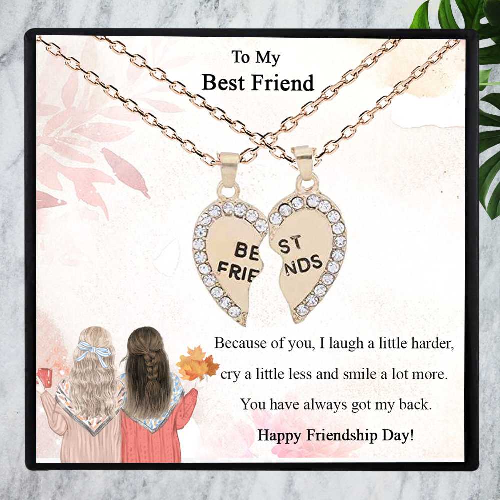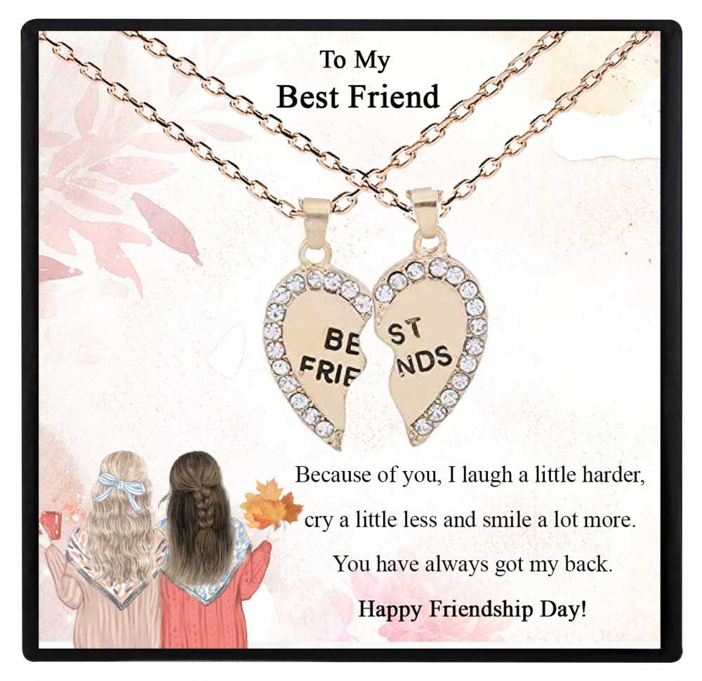 Give your best friend a dazzling gift of love and friendship with this unique rhinestone-studded personalized heart pendant with a cute message card that transcribes your feelings beautifully. This adorable two-piece heart necklace is split down in the middle to show the love you two share and is engraved with the caption Best Friend. Both pieces of the split heart necklace fit perfectly together to form one heart and can be worn separately or worn both as layered jewelry. This personalized friendship pendant necklaces is unique gift that will make meaningful jewelry for you or your loved ones.