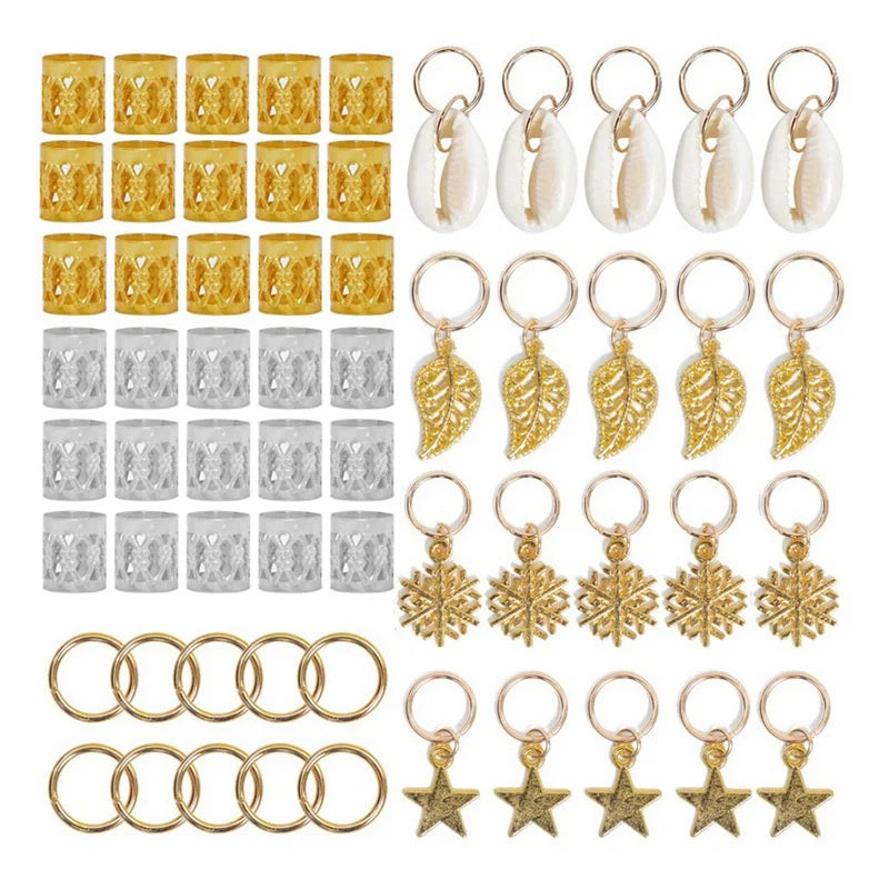 Enhance your hairstyle with this set of 80 African hair jewelry pieces, including metal hair ring tubes, cuffs, and dread beads.
