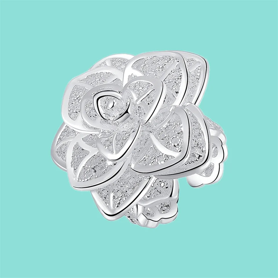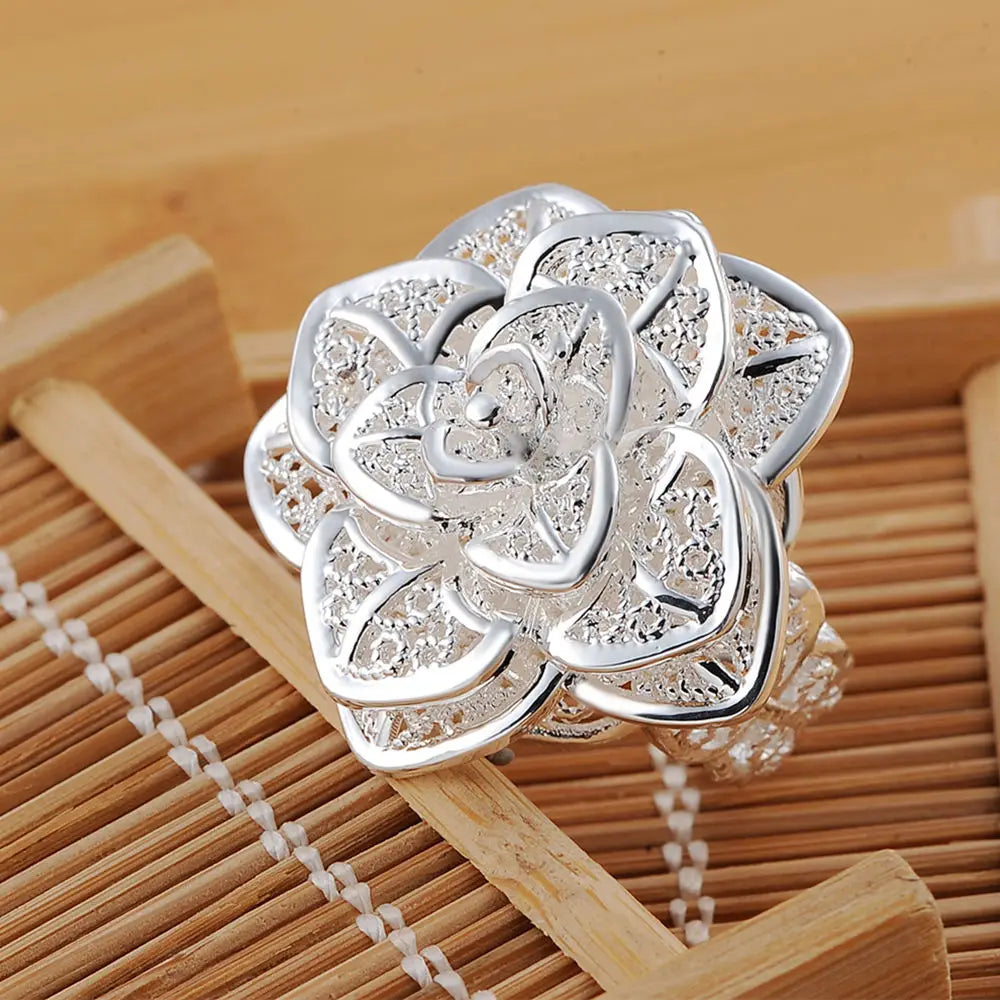 925 Silver Rose Flower Open Ring Hollow Out For Women Wedding Party