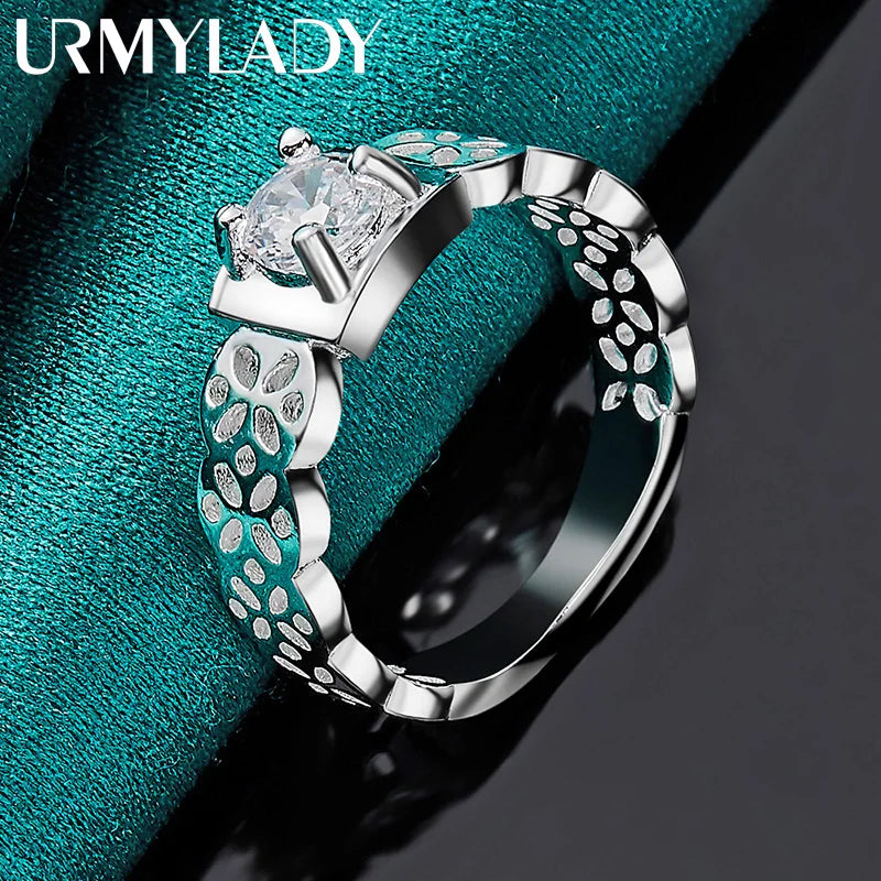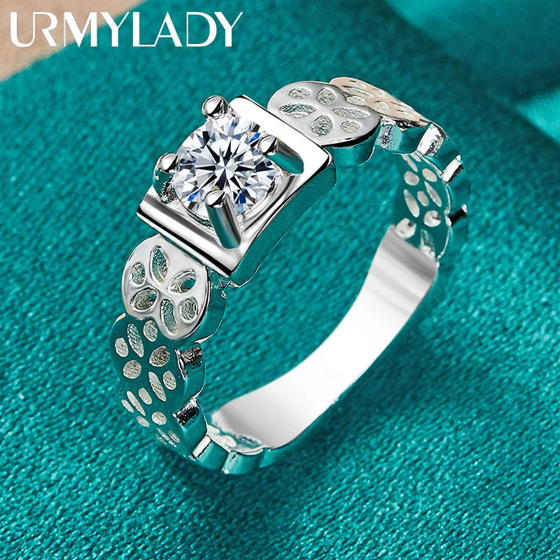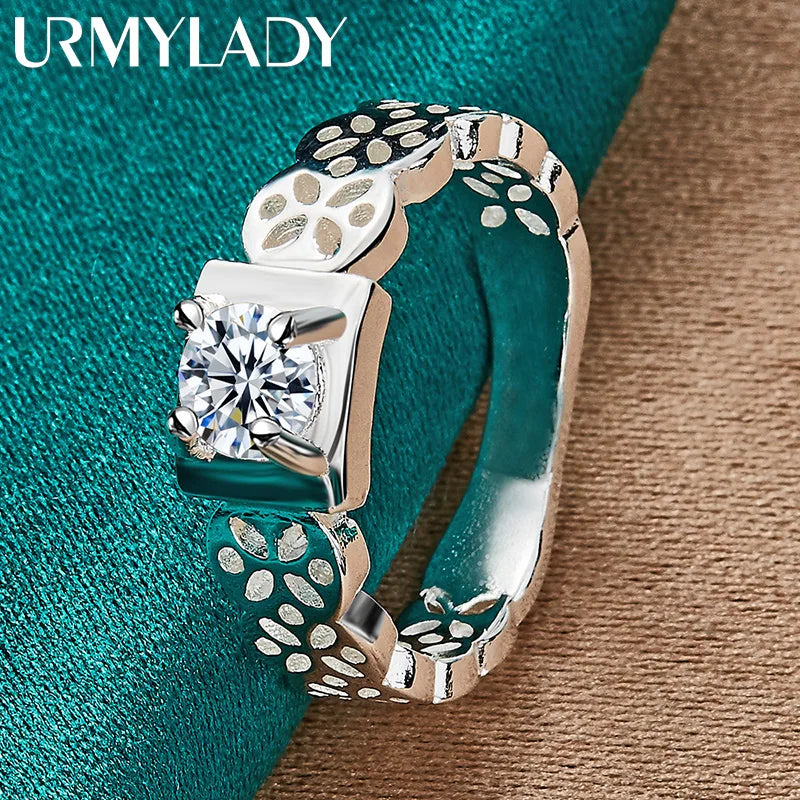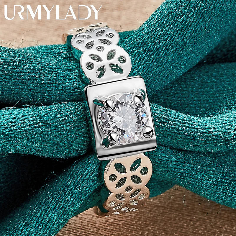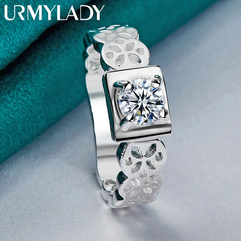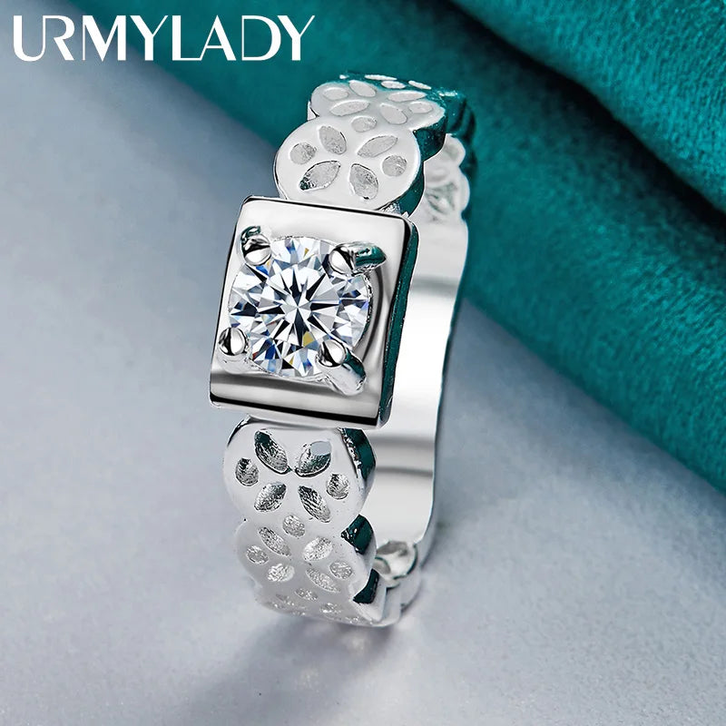 Elegant 925 sterling silver ring featuring a square zircon with hollow design. Perfect for weddings and engagements.