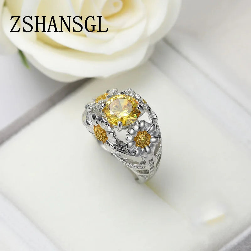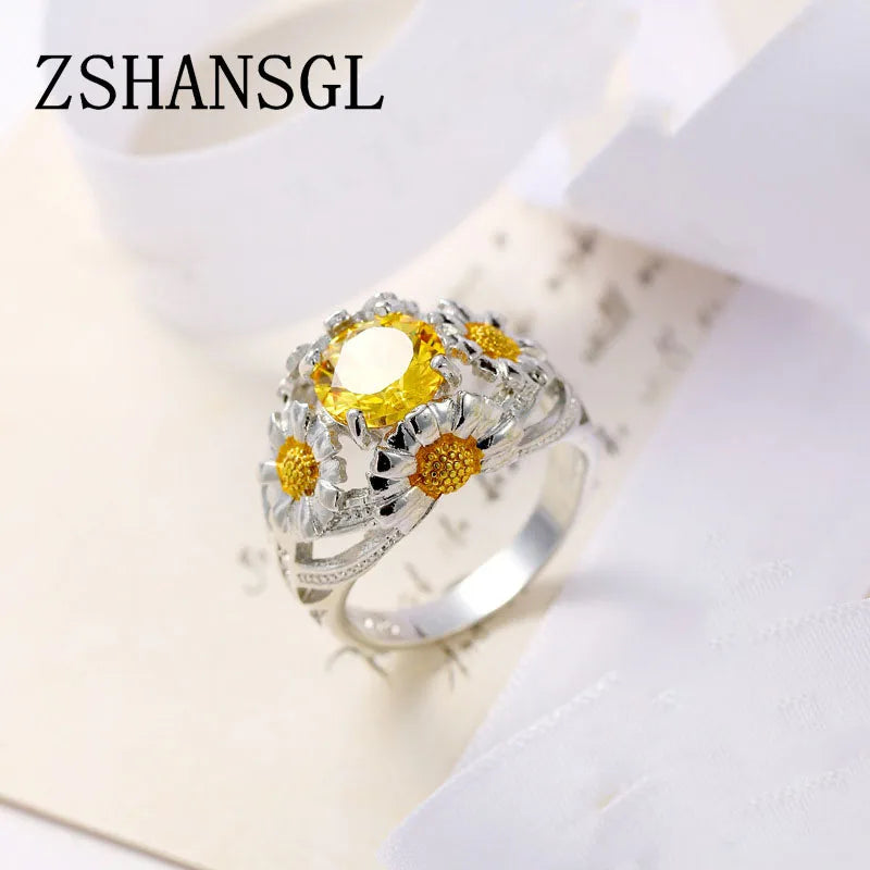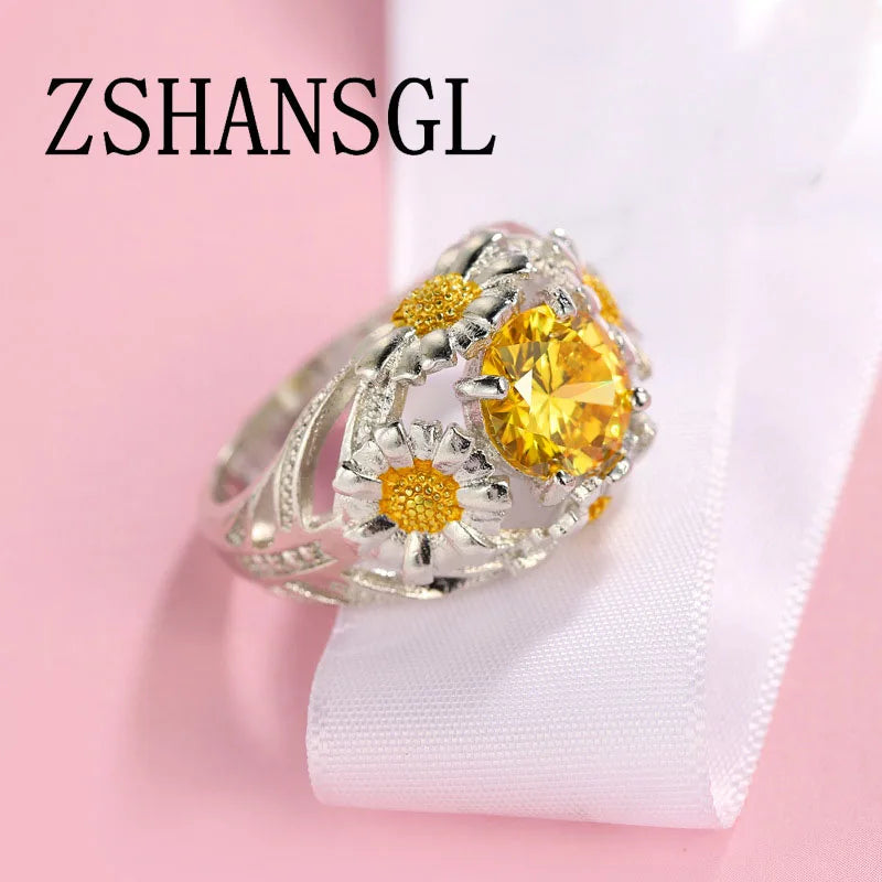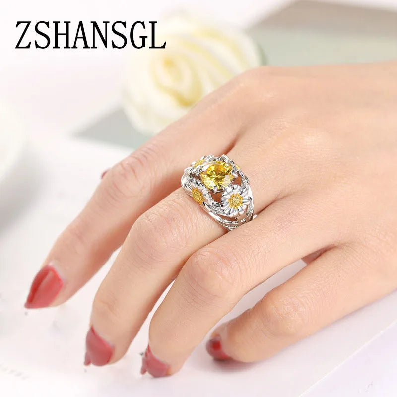 This stunning boho chic ring features a large crystal CZ flower design in silver and yellow tones, perfect for any occasion.