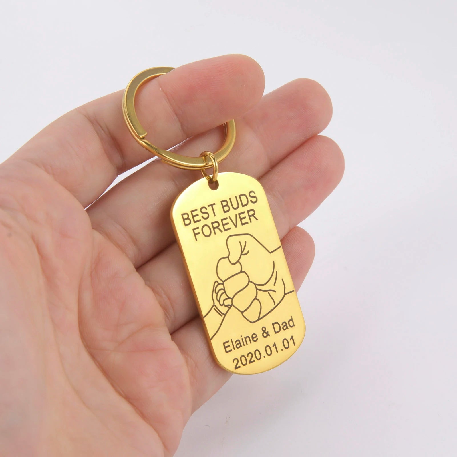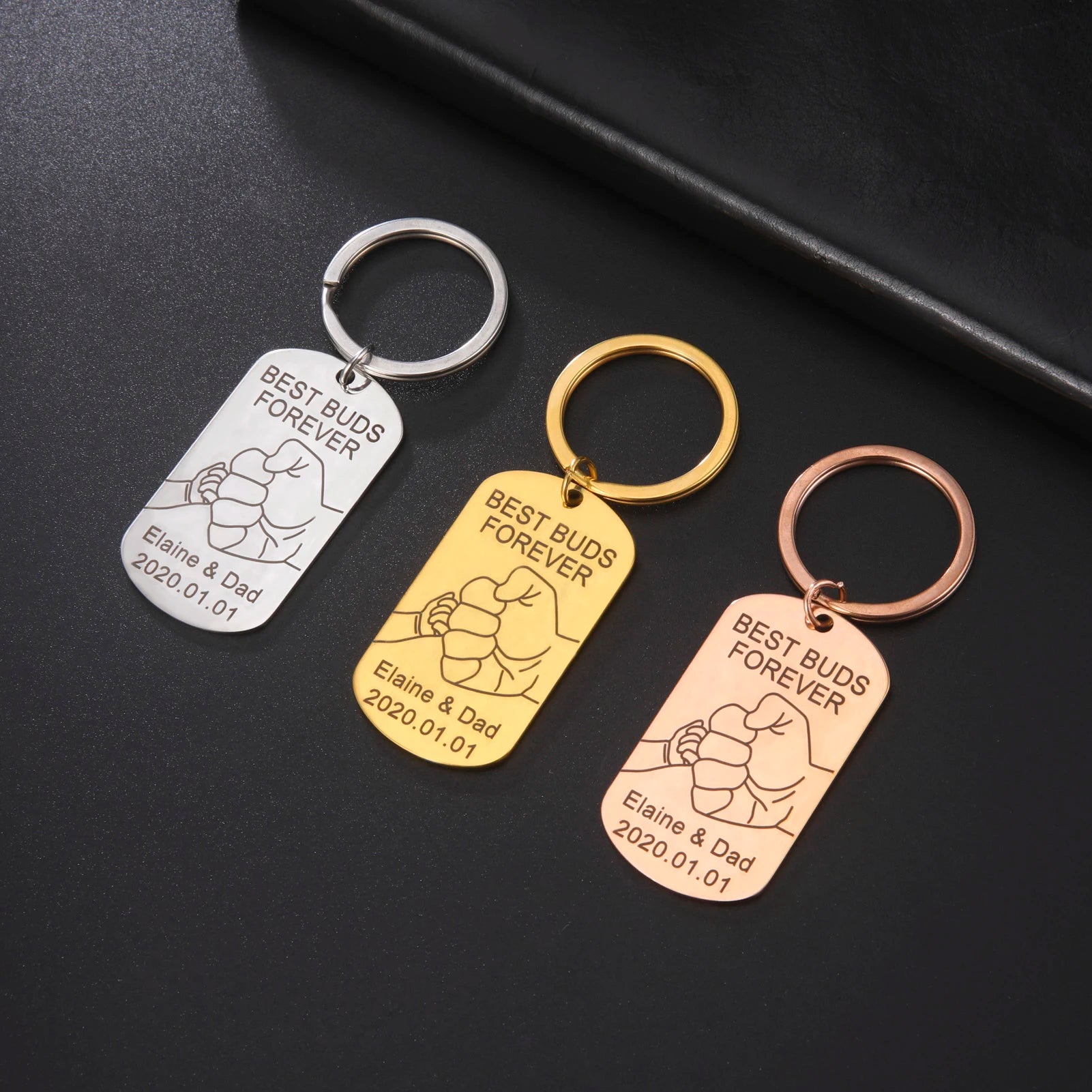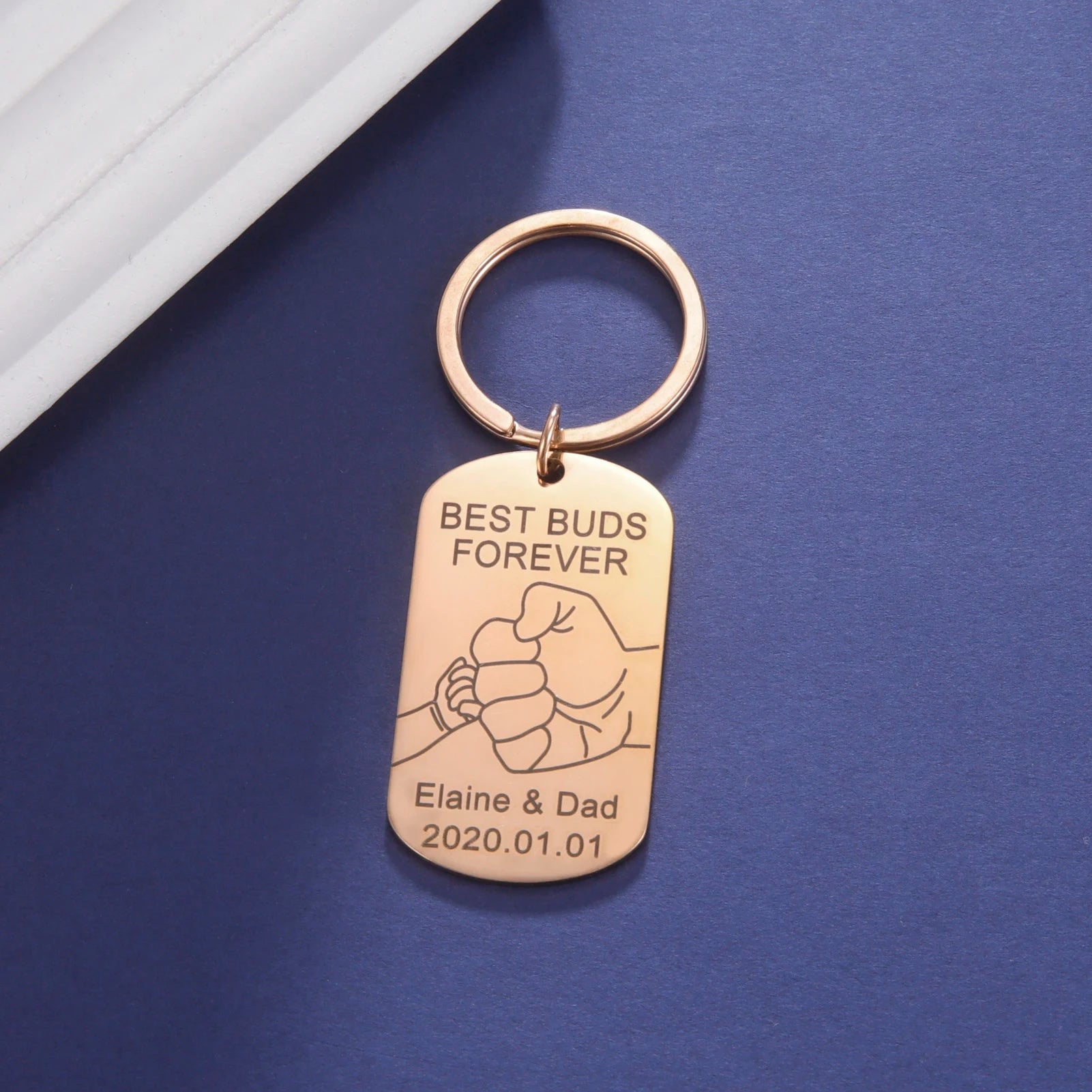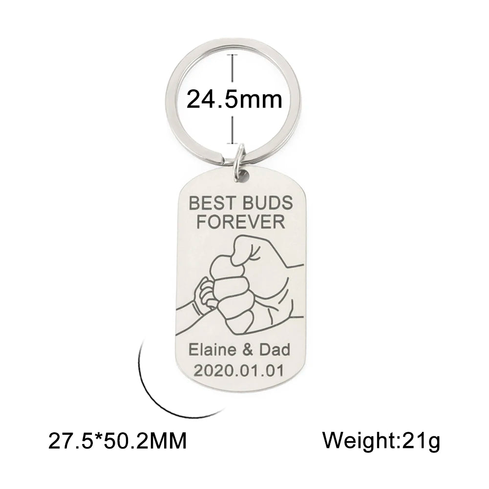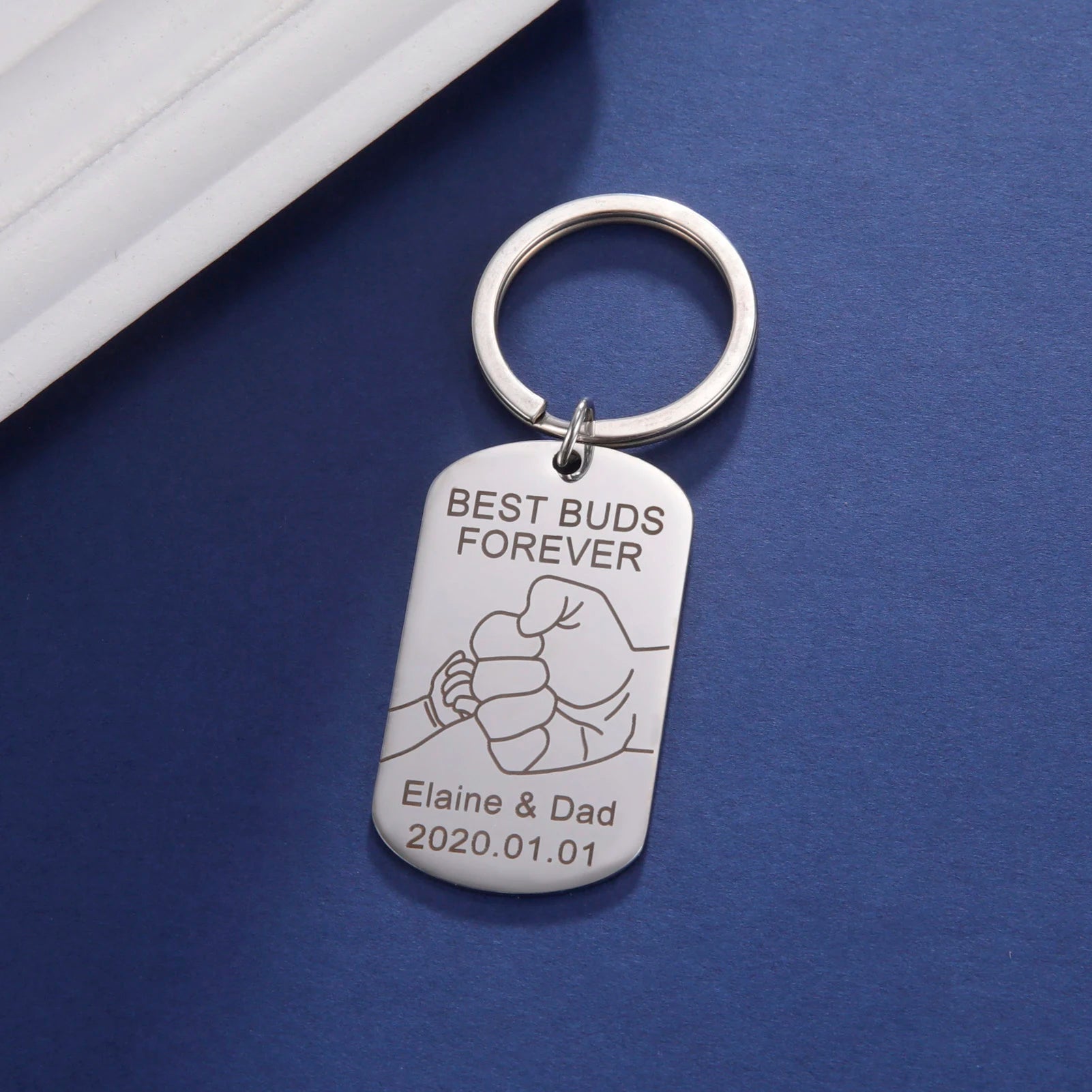 Stainless steel keychain featuring personalized name and date, perfect gift for men, women, or dads. Durable and stylish accessory.