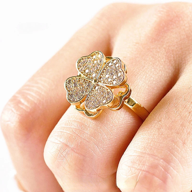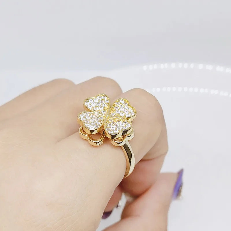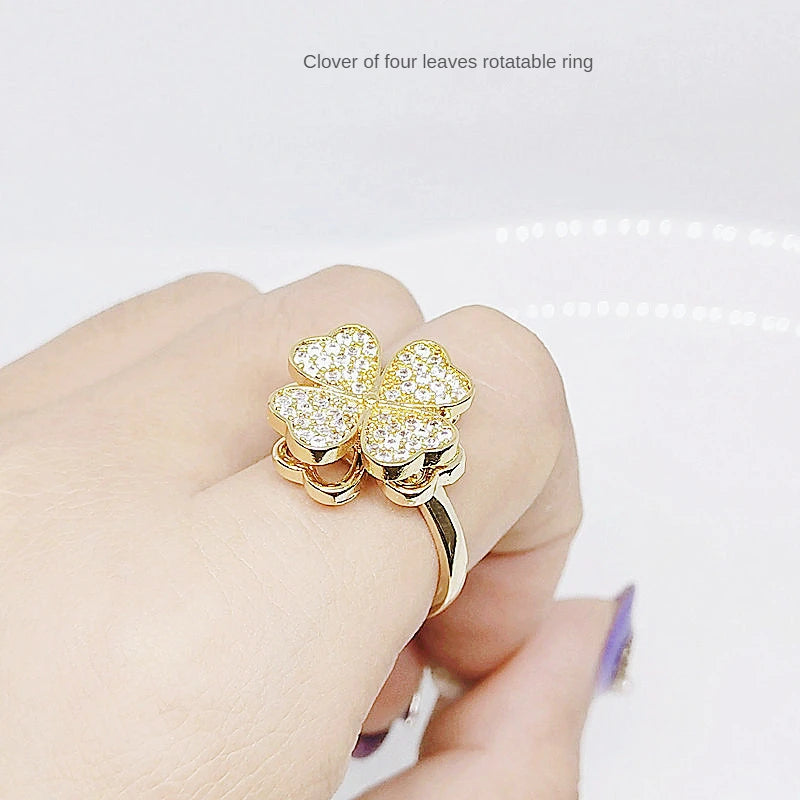 This charming ring features a rotating four-leaf clover design with micro-set zircons, exuding a fairy-like and elegant temperament.