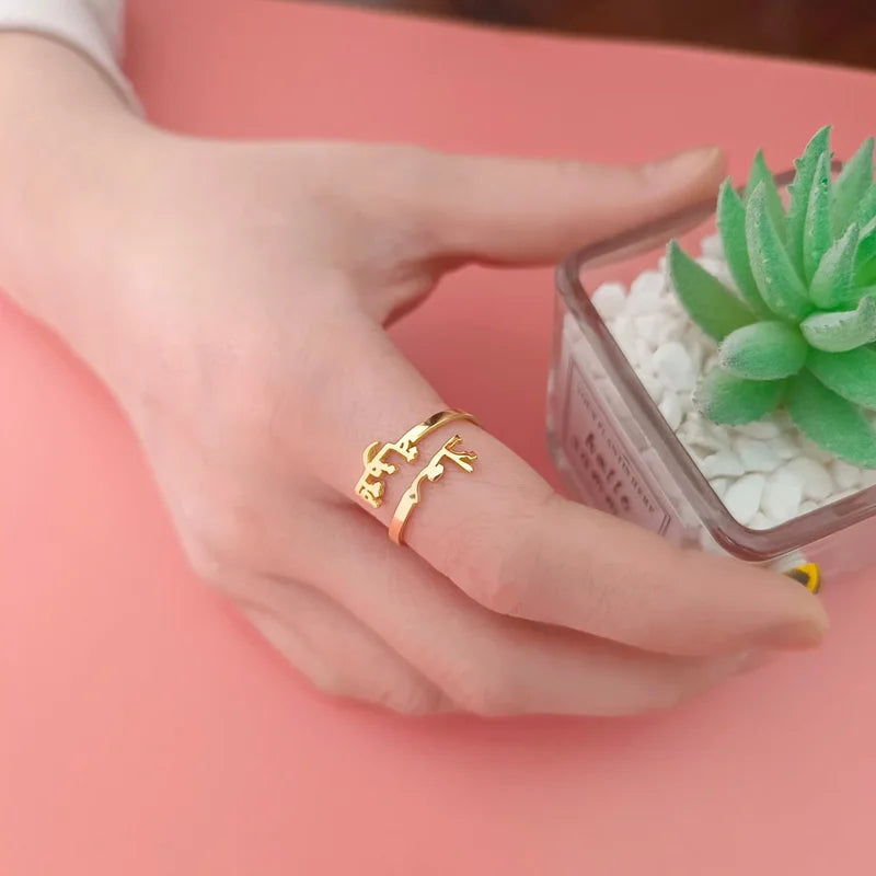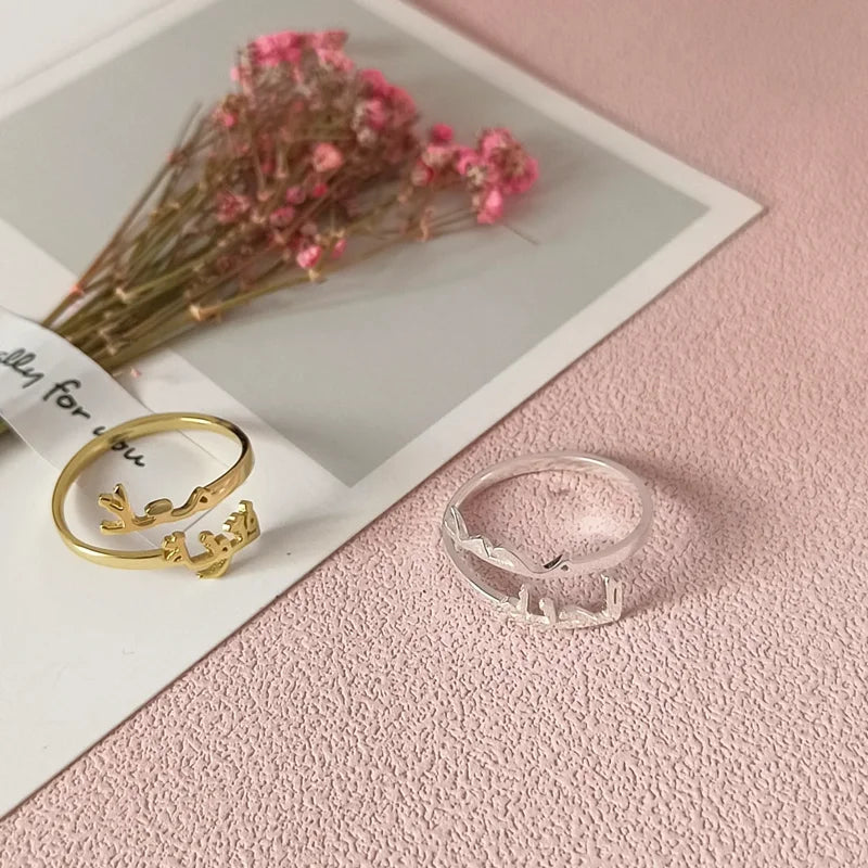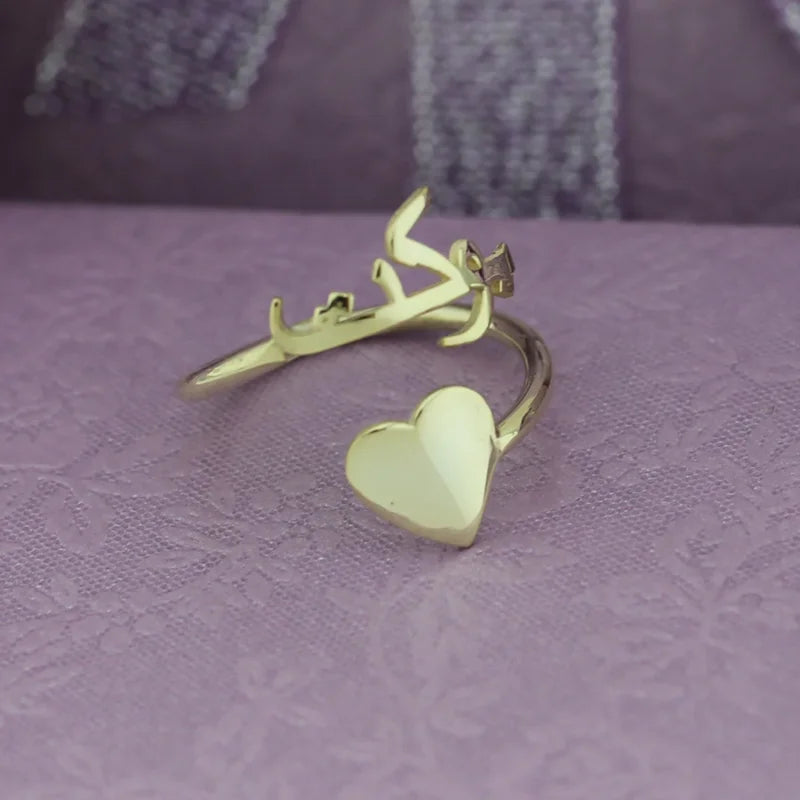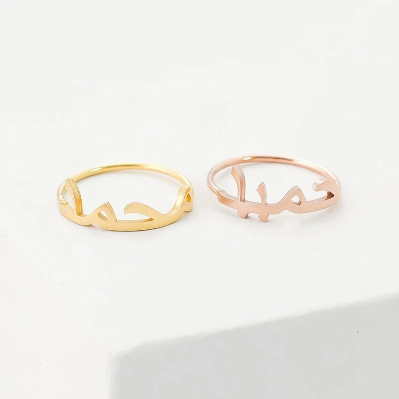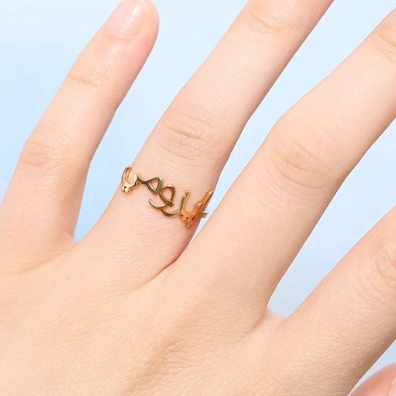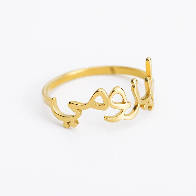 Get your own custom Arabic name ring with two Farsi names in English translation. Made from high-quality stainless steel, this personalized jewelry is a unique and meaningful gift.