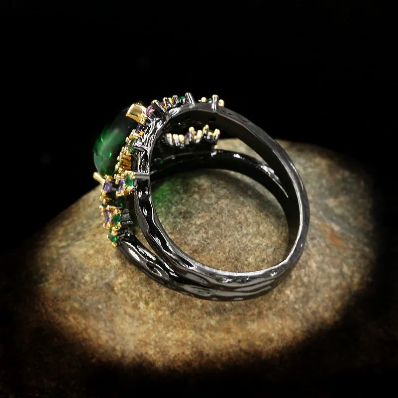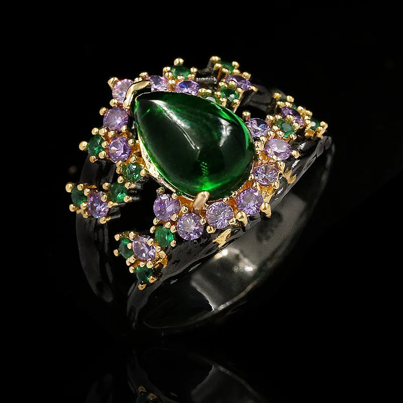 Experience the beauty of Italian craftsmanship with this exquisite water drop emerald ring micro inlaid with purple zircon. A stunning piece of jewelry for elegant women.