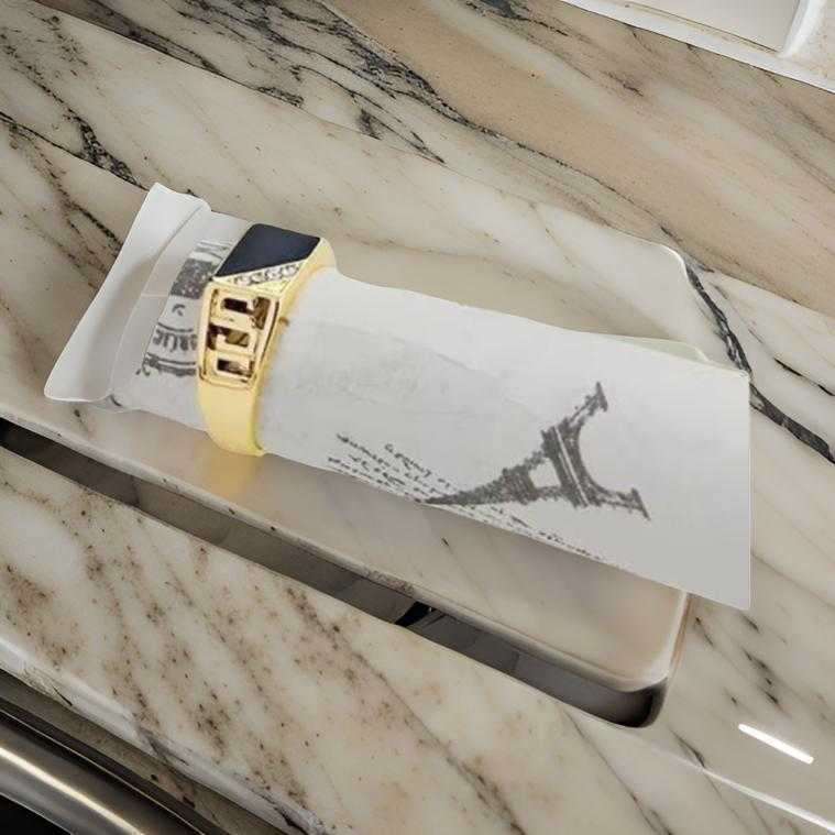 Bling Queen is an affordable fashion jewellery brand with various product types like bracelets, necklaces, earrings, rings, etc. suitable for women, men and kids. The base of the ring is gold plated, offering a warm, luxurious shine that captures the eye. The gold plating enhances its overall aesthetic, giving it a rich appearance that is both refined and contemporary. This radiant finish complements a variety of outfits, making it suitable for both casual and formal occasions. At the center of the design is a bold black enamel inlay that adds depth and contrast to the ring. The sleek black surface is smooth and polished, creating a striking visual impact against the shimmering gold. This combination of black enamel and gold plating creates a modern yet classic look that appeals to the discerning man. Surrounding the square center is a arrangement of rhinestones, which add a touch of sparkle and sophistication. The rhinestones are carefully set to catch the light beautifully, offering a hint of glamour without overwhelming the design.