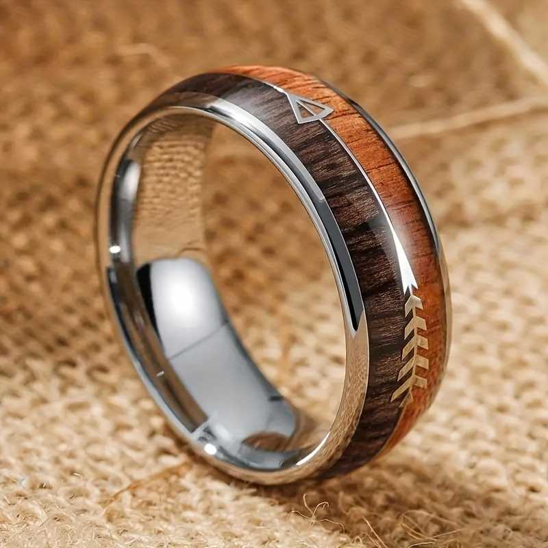Men's Stainless Steel Arrow Ring with Elegant Wood Inlay