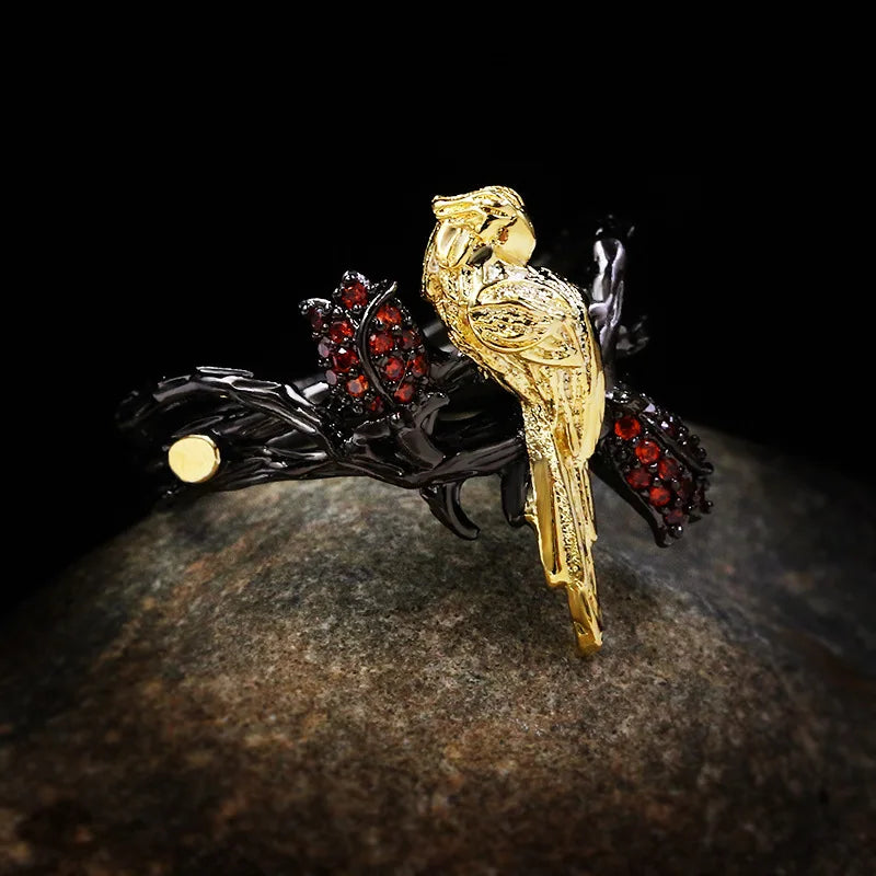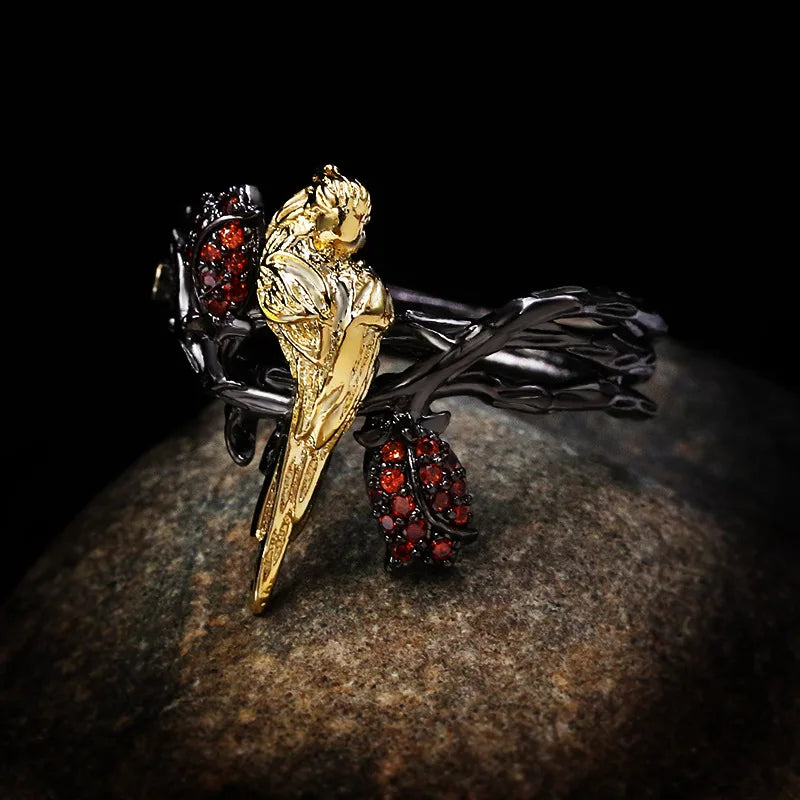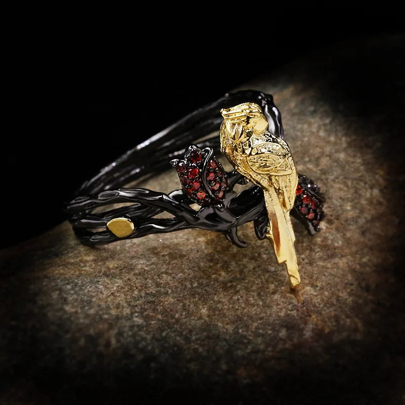 Add a touch of nature to your style with this stunning parrot wedding band ring. Featuring red zircon stones and two-tone design, this unique piece is perfect for any occasion.