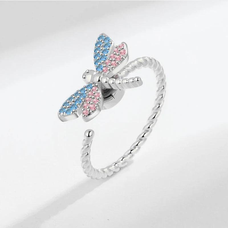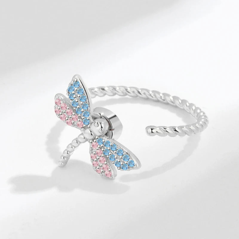 This inlaid pink crystal dragonfly rotating ring is a sweet and high-quality engagement jewelry piece for women. It is adjustable and adds a touch of elegance to any outfit.