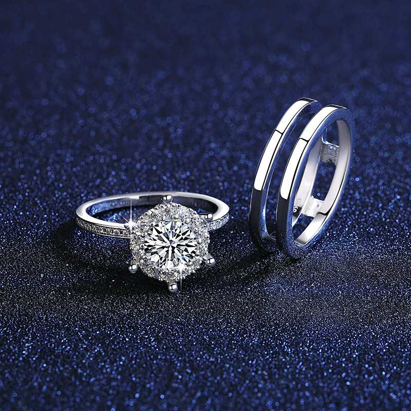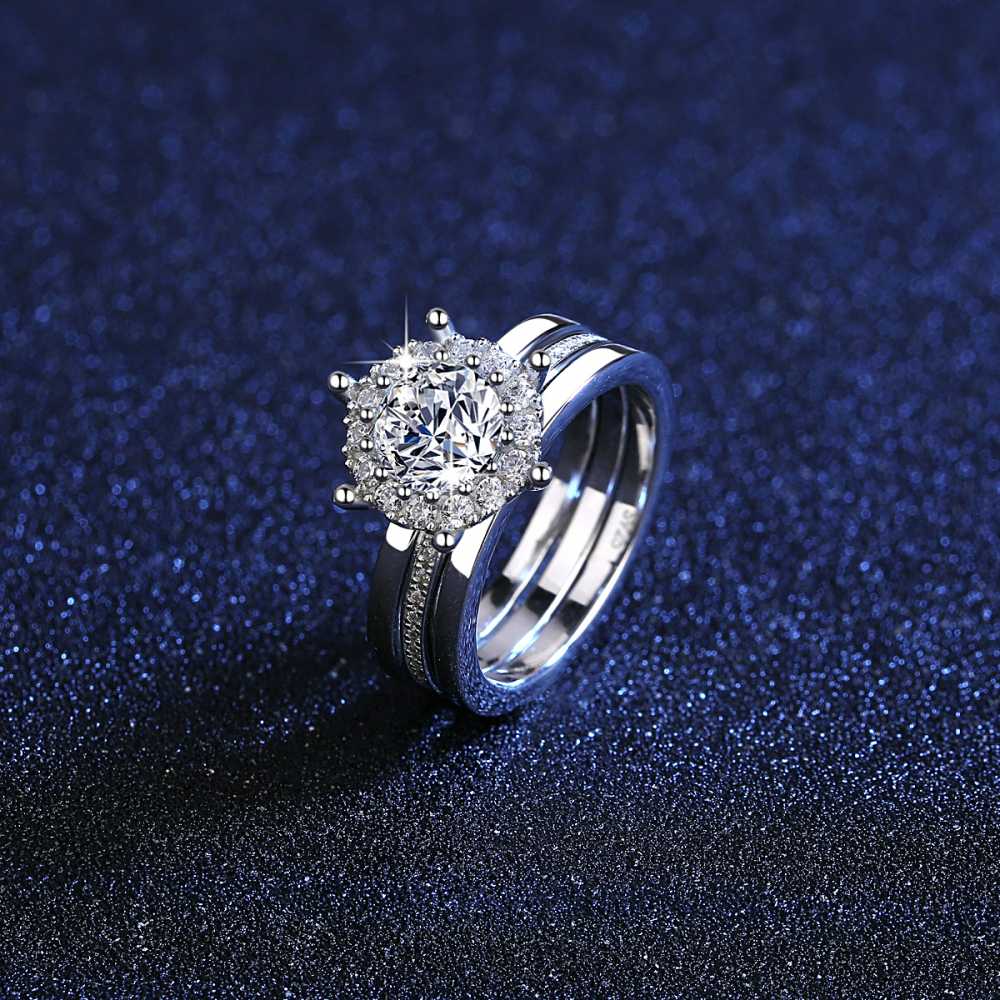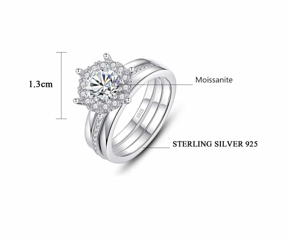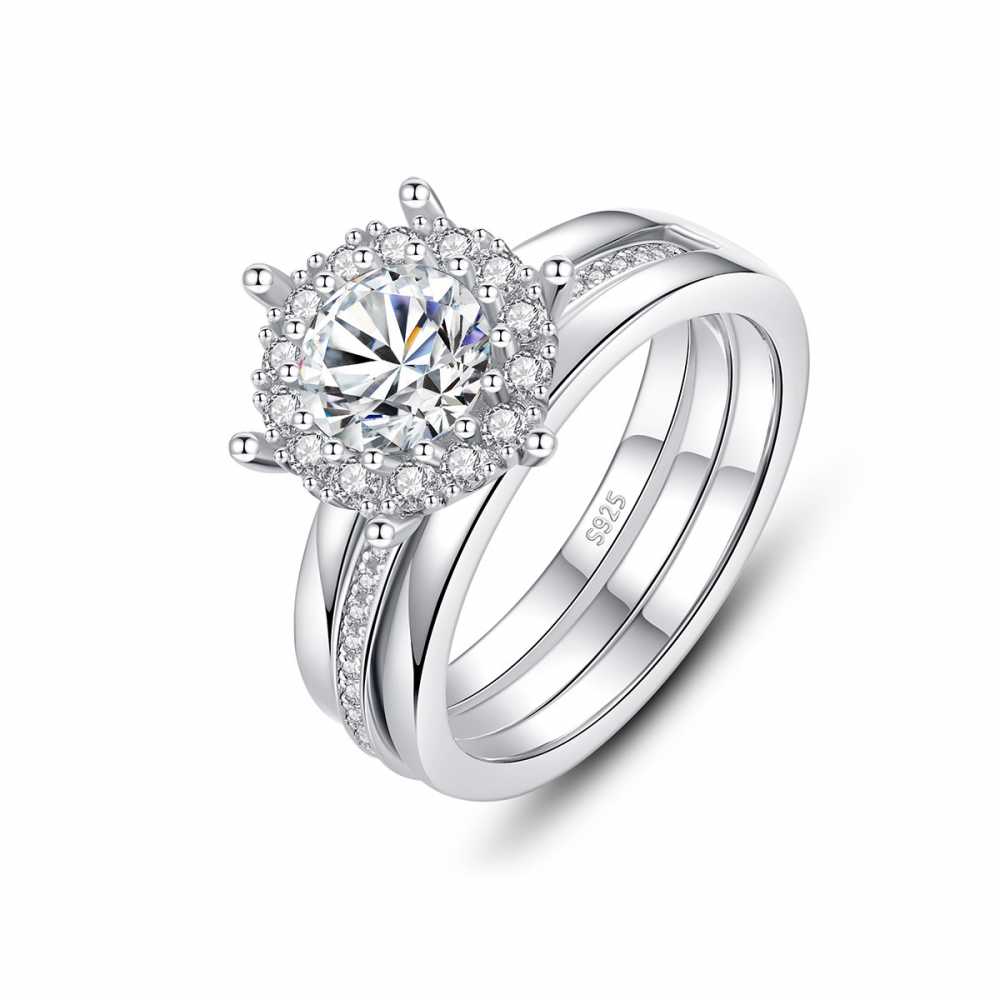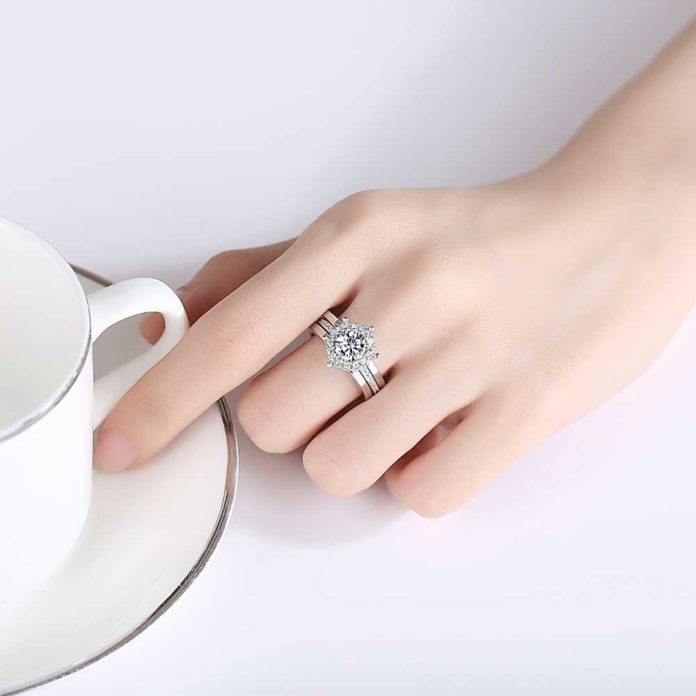 Delight your loved one with this layered ring that features two rings. The first ring is a layered polished band and the second ring is a detachable ring that can be inserted in the middle and has a solitaire round zirconia arranged in a moissanite frame at the center. A halo frame of smaller accent zirconia surrounds this center and also lines the ring's shank.