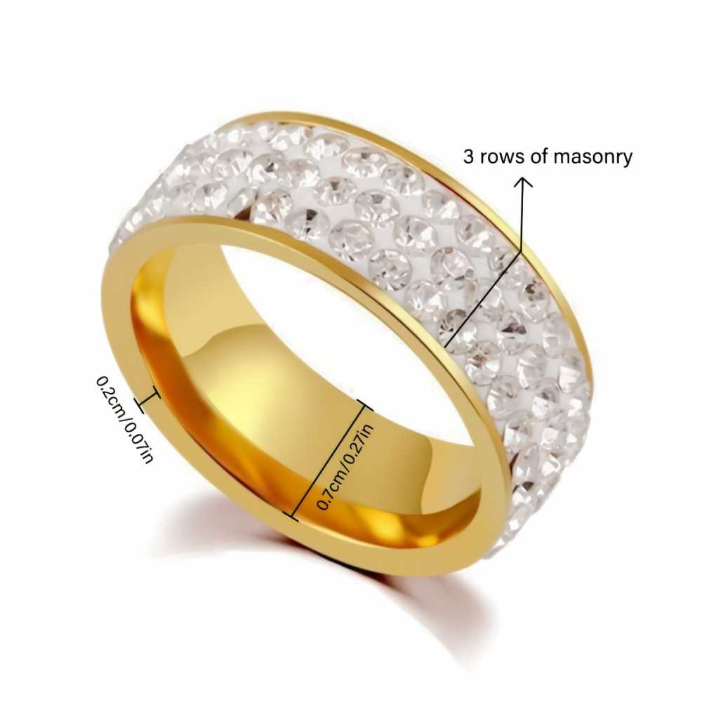 This stunning piece features a lavish tones band that exudes timeless elegance. Adorning the surface are glistening cubic zirconia stones, meticulously set to create a mesmerizing cascade of brilliance. Each stone captures and reflects light with unparalleled radiance, infusing the ring with an enchanting sparkle that captivates attention wherever it goes. The width of the ring grants it a bold and striking presence on the finger, making it an ideal statement piece for those seeking refined luxury and modern sophistication. This ring effortlessly combines classic charm with contemporary style, making it a versatile accessory that elevates any ensemble, whether it is paired with formal attire for special occasions or worn as a dazzling accent to complement everyday looks. Embrace the allure of timeless beauty and adorn your fingers with this radiant treasure, designed to evoke elegance and grace with every glance.