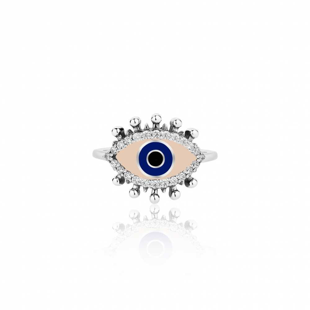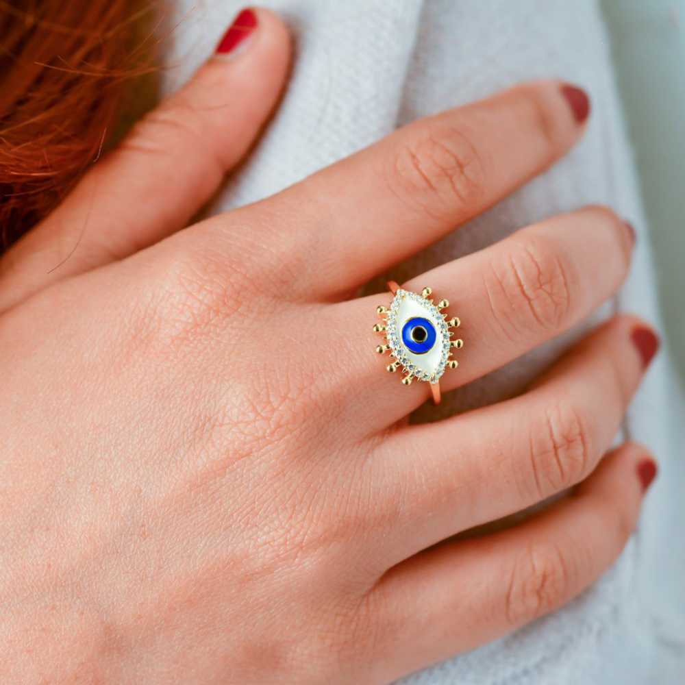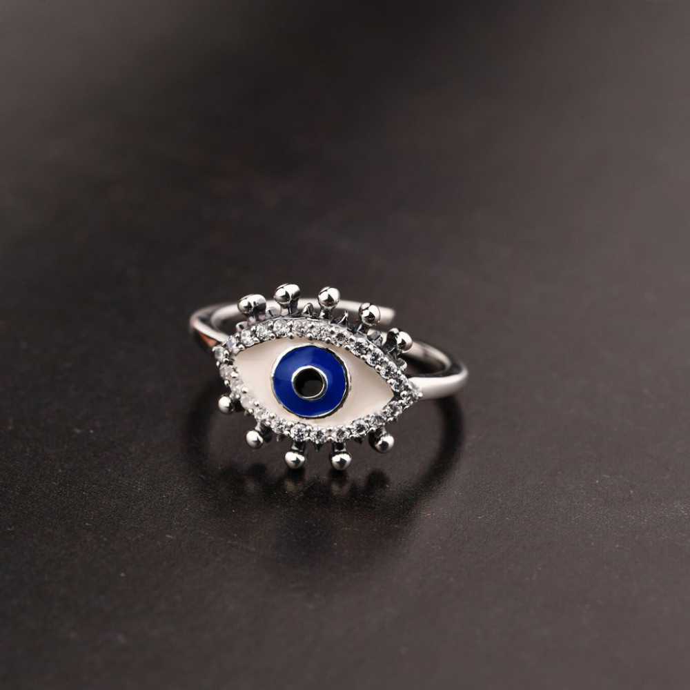This silver plated metal evil eye adjustable ring is embellished with cubic zirconia. The adjustable ring fits most ring sizes. A must-have add-on to your jewellery collection. An ideal gift choice for your near and dear ones.