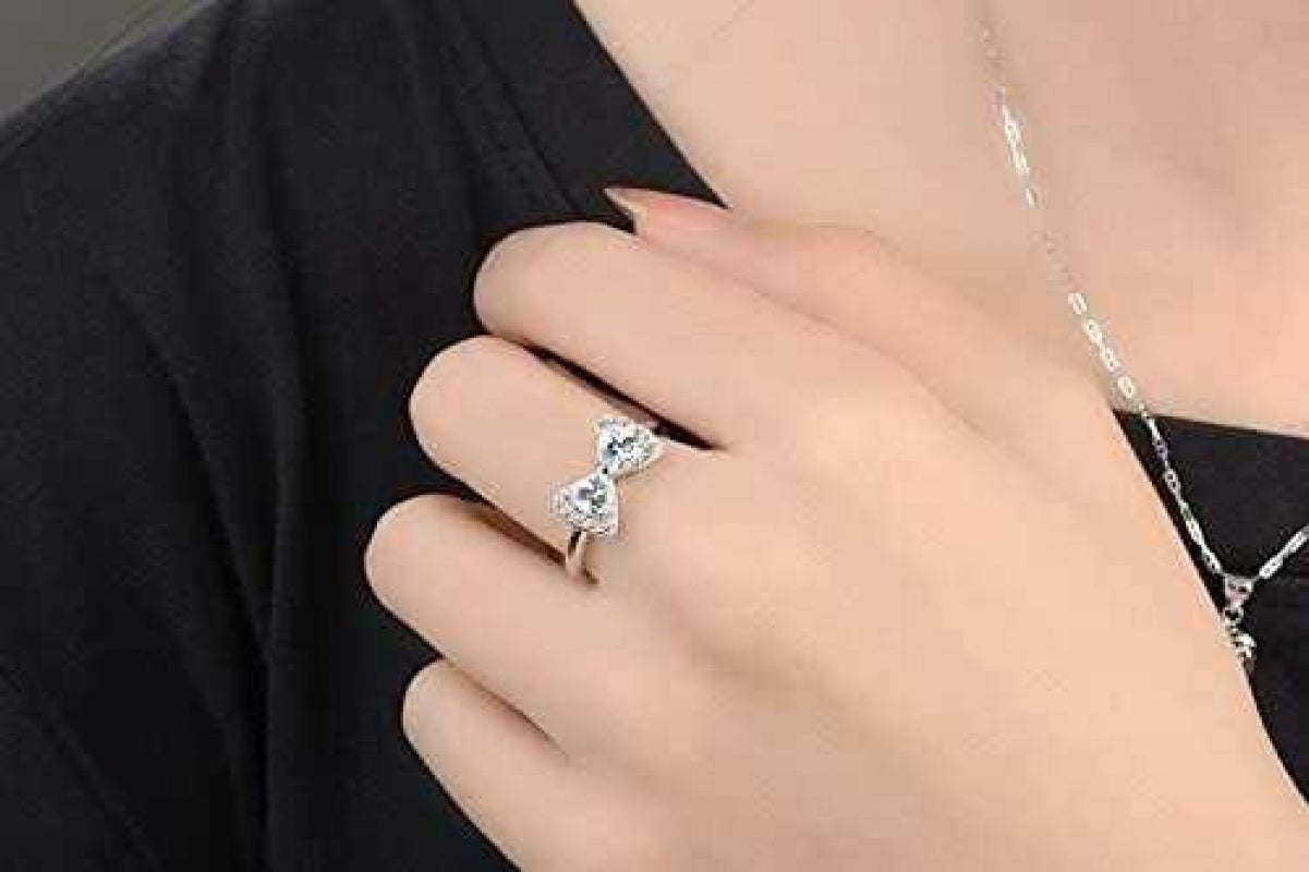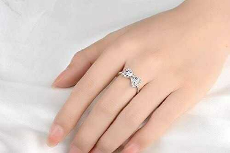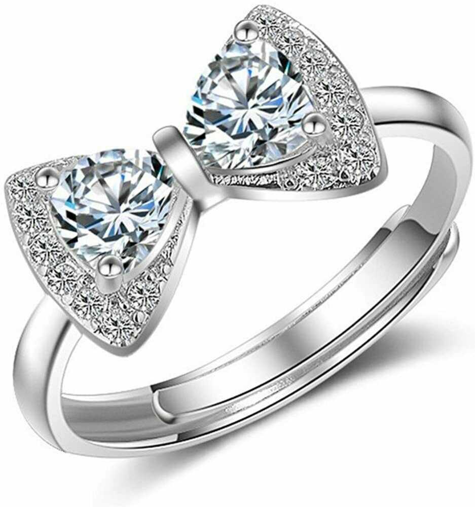 A timeless piece that effortlessly combines elegance and sophistication. Crafted with precision and attention to detail, this exquisite ring is more than just a piece of jewelry, it is a statement of style and grace. The ring features a charming bowtie design, symbolizing femininity and grace. The silver plated band adds a touch of classic beauty, creating a perfect balance between modern trends and timeless appeal. The meticulous craftsmanship ensures durability and longevity, making it a cherished accessory for years to come. The use of premium cubic zirconia stones adds a dazzling sparkle, mimicking the brilliance of genuine diamonds without compromising on quality. The adjustable band ensures a comfortable and secure fit for any finger size. This thoughtful design element adds versatility to the ring, allowing you to wear it on different fingers or even gift it without worrying about size constraints. Whether you are attending a formal event, a casual gathering, or just adding a touch of sophistication to your everyday attire, this ring is the perfect choice. Its versatile design effortlessly transitions from day to night, making it a must-have accessory for any woman's jewelry collection. Presented in an elegant jewelry box, this ring makes for an exquisite gift for your loved ones or a delightful addition to your own collection. The carefully curated packaging reflects the importance of the piece inside, making it an ideal choice for special occasions, birthdays, anniversaries, or just to show someone you care. To maintain the radiant shine of your ring, simply wipe it gently with a soft cloth after each wear. Store it in the provided jewelry box to protect it from dust and scratches, ensuring its enduring beauty for years to come. It is a symbol of enduring elegance and refined style. Its timeless design, coupled with quality craftsmanship and premium materials, makes it a valuable addition to any jewelry collection. Elevate your look and celebrate your individuality with this exquisite piece that transcends trends and stands the test of time.