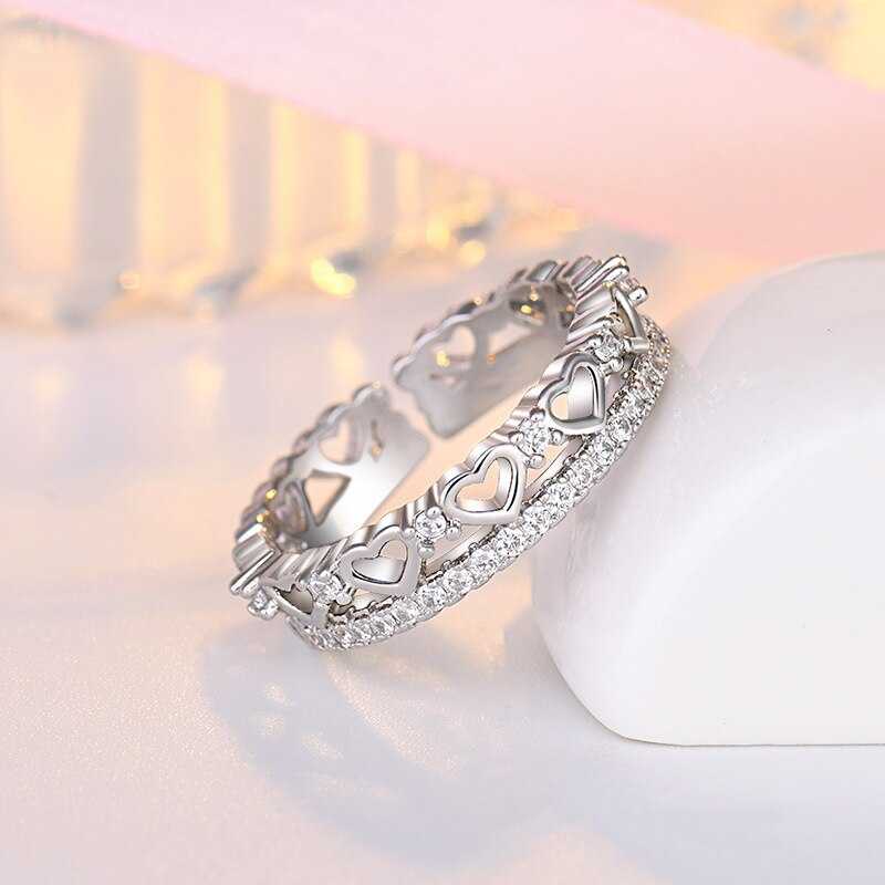 This heart pattern ring in silver features a fun retro fashion to make your everyday look even more attractive. This sterling silver ring features one layer of the heart-shaped disc and a second layer bursting with cubic zirconia. And this is a perfect blend of shine and simplicity. This piece is designed to represent the beauty and integrity of the world around us. The clean design combined with elements adds uniqueness to an essential shape.