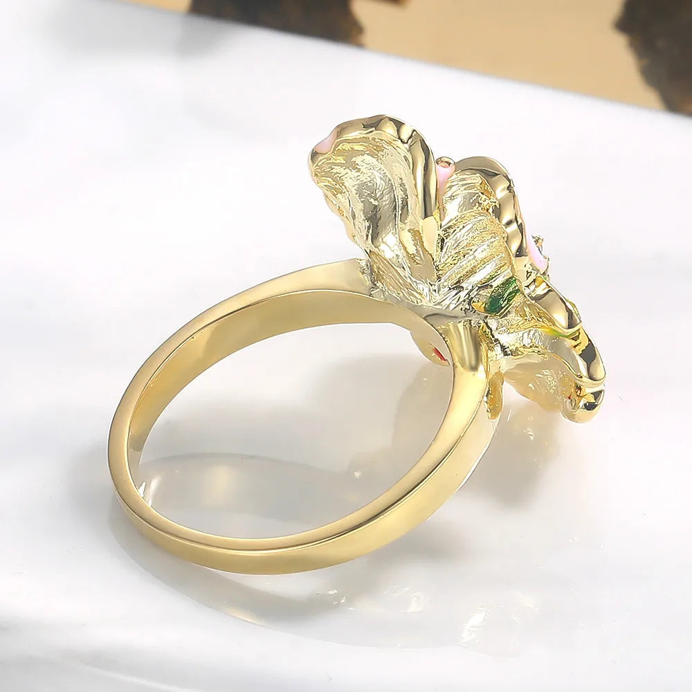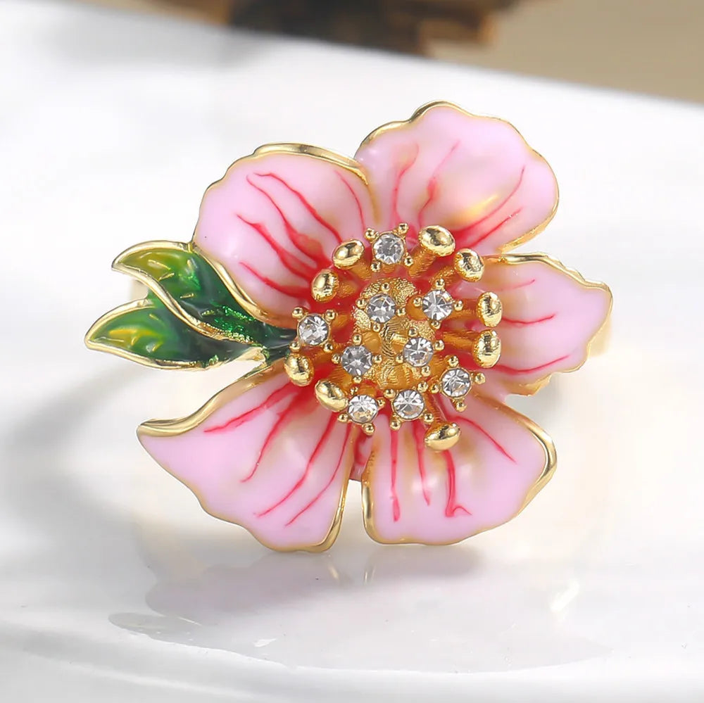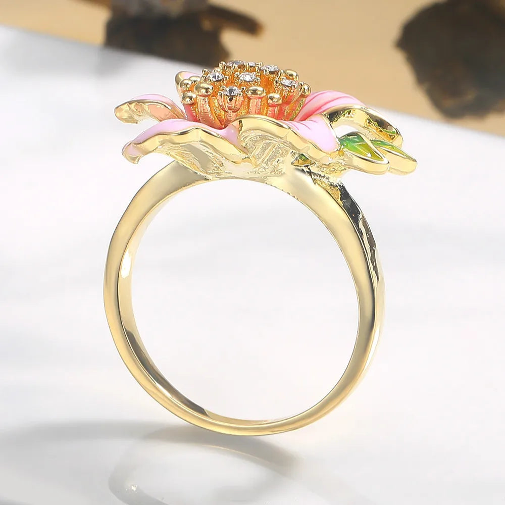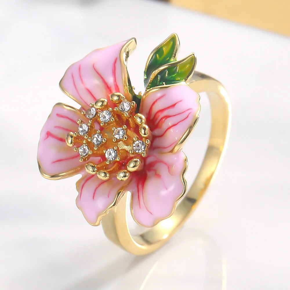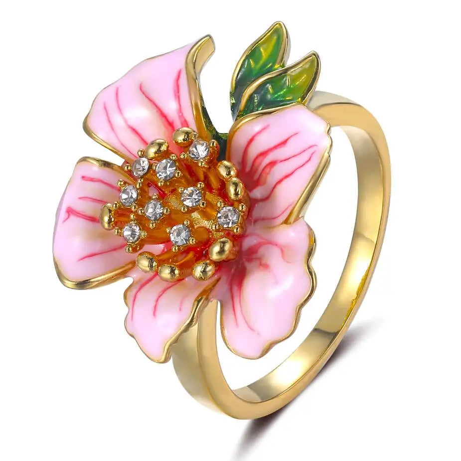 - Yellow flower ring with pink enamel and crystal accents