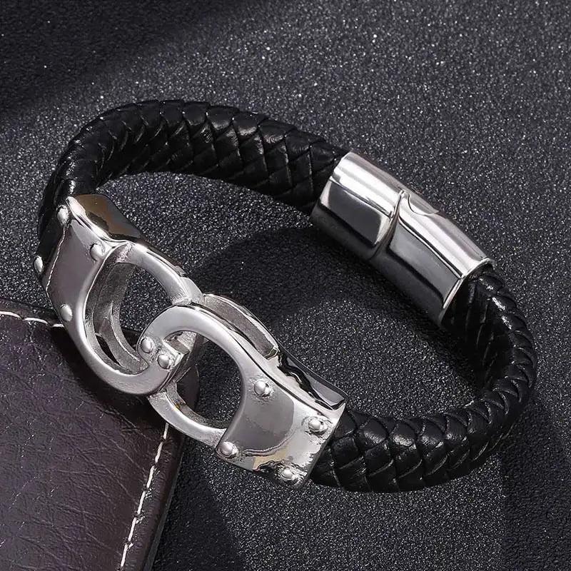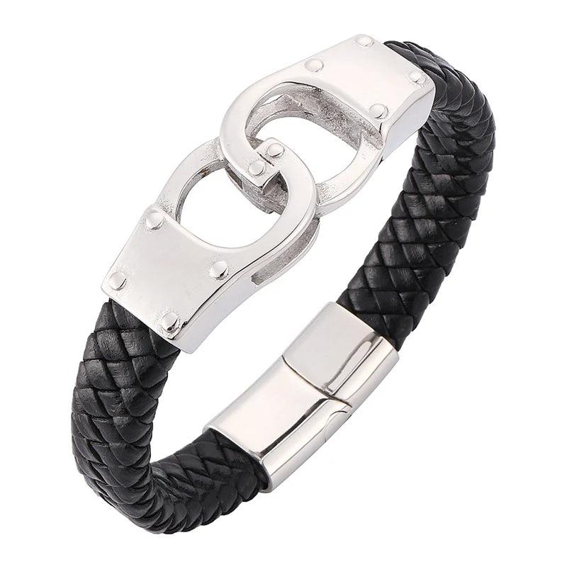 Make a bold statement with this black/brown braided leather bracelet featuring stainless steel handcuffs and a magnetic buckle. Perfect for punk style lovers.