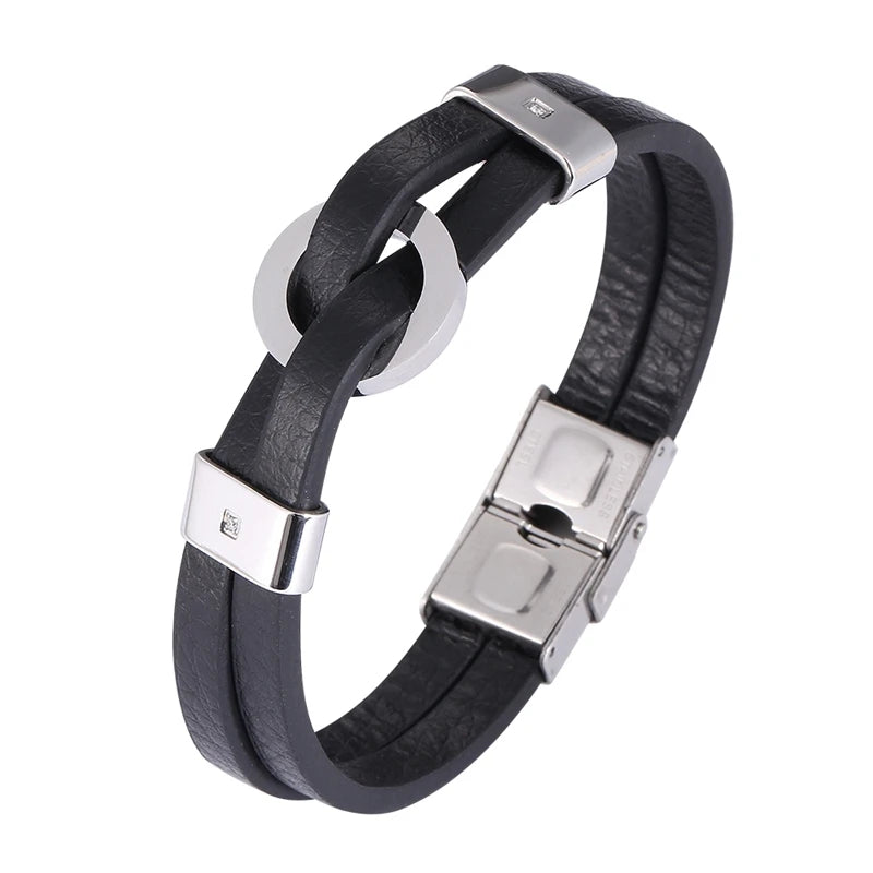 Double Layer Leather Hand Bracelet Stainless Steel Bangles Gift