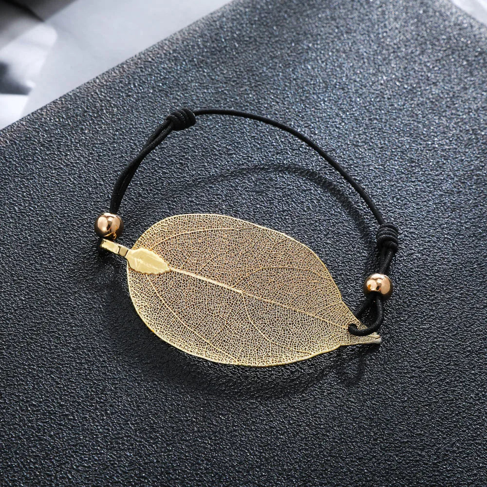 This elegant bracelet features real natural leaf charms, adjustable rope design, and a silver finish. Perfect for women.