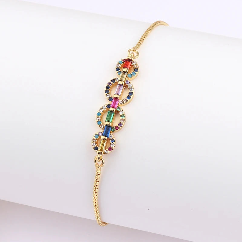 Add a pop of color to your outfit with this stunning rainbow tennis bracelet. Perfect for parties, weddings, or everyday wear, this adjustable bracelet is a must-have accessory for any fashion-forward woman.
