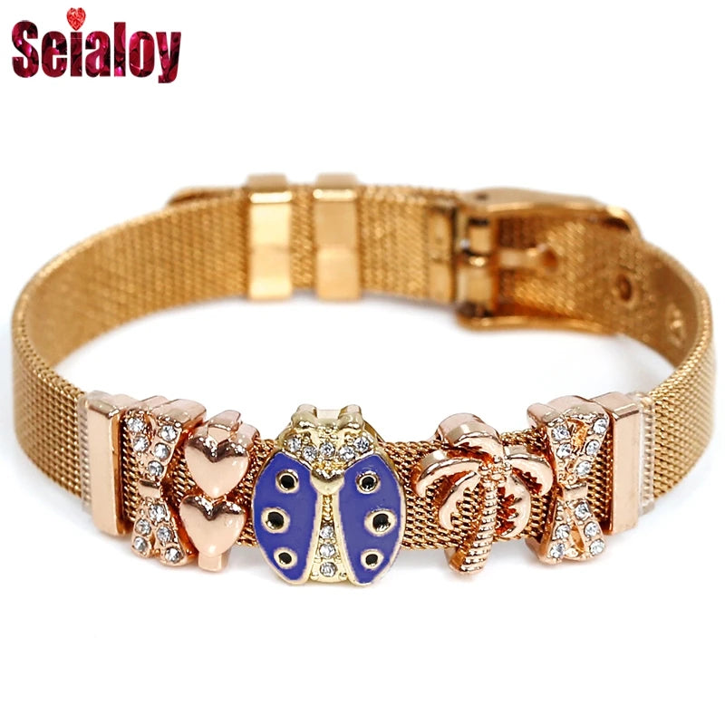 Stainless Steel Mesh Ladybug Palm Tree Charm Bracelet Watch