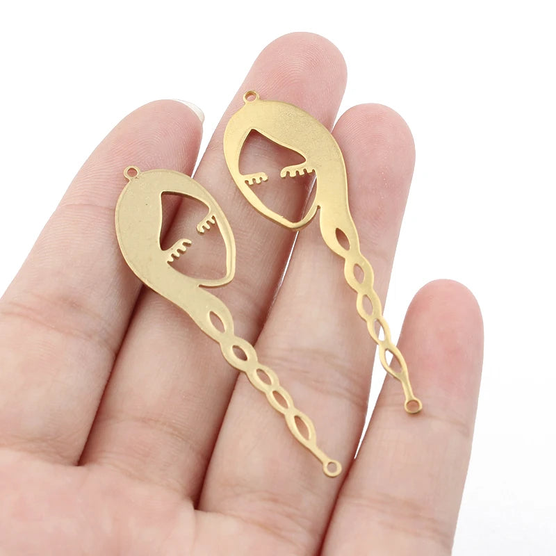 Create unique and stylish earrings with these raw brass abstract human face charms featuring long hair. Perfect for jewelry making and crafting projects.