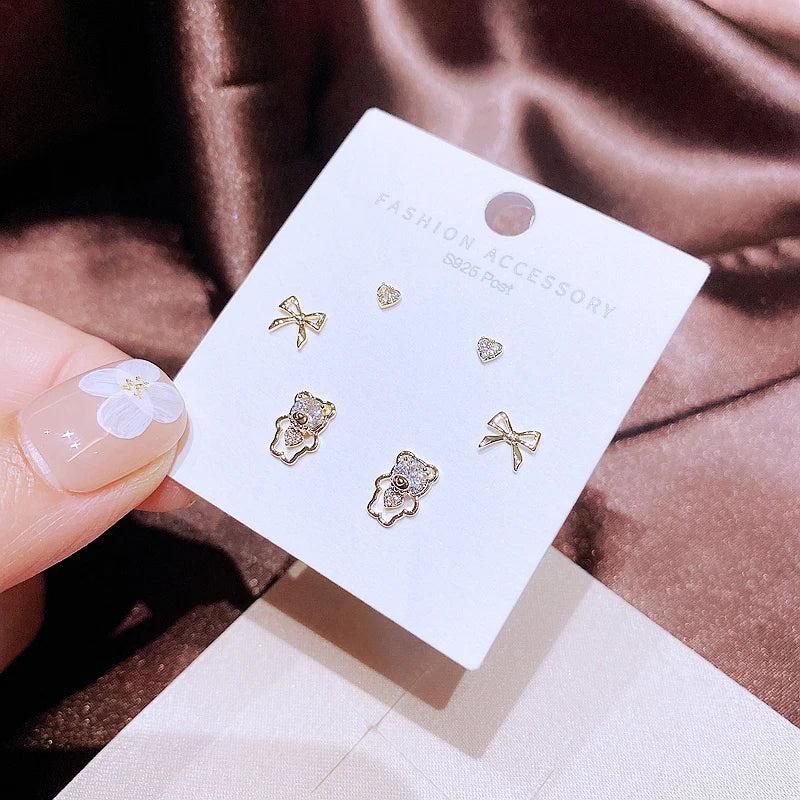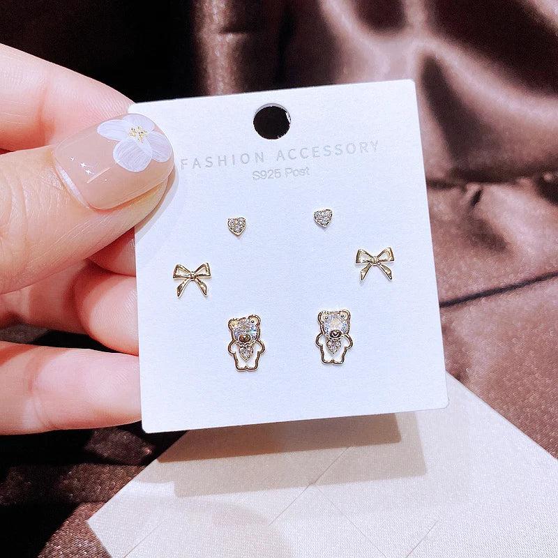 3 Pairs Zircon Crystal Stud Earrings Set Heart Bowknot Bear Women Jewelry