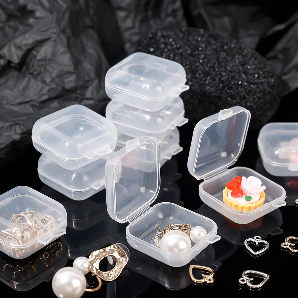 Keep your earrings and jewelry organized with these small square plastic storage boxes. The transparent design allows you to easily see the contents.