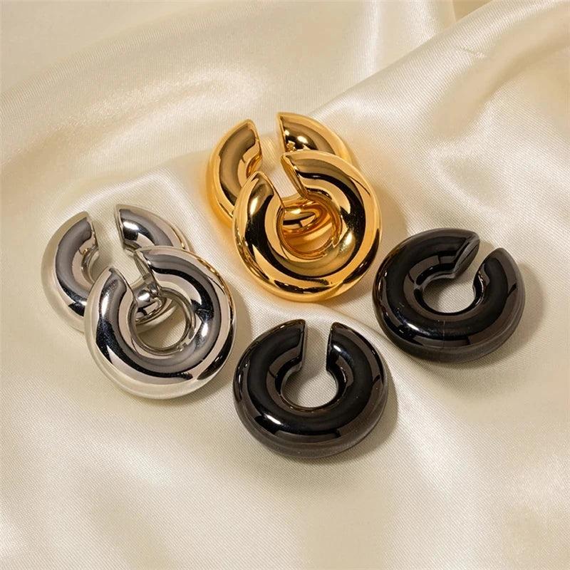 These earrings feature a thick cylindrical design with a chunky metal geometric round shape. Perfect for a modern and stylish look.