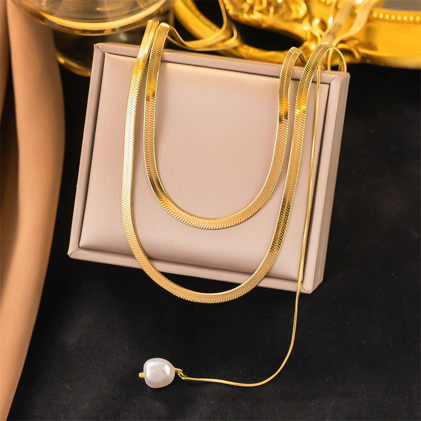 316L Stainless Steel 3 Layer Pearl Pendant Flat Snake Bone Chain Necklace