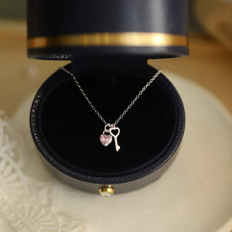 This exquisite 925 silver necklace features a key and heart pendant adorned with sparkling zircon stones. Perfect for weddings or Christmas gifts.