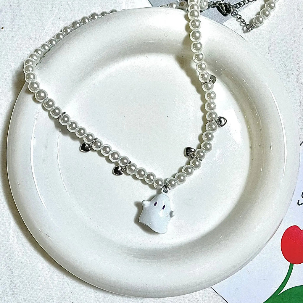 Cartoon Ghost Pendant Necklace Sweet Heart Charms Beaded Choker Y2k Jewelry