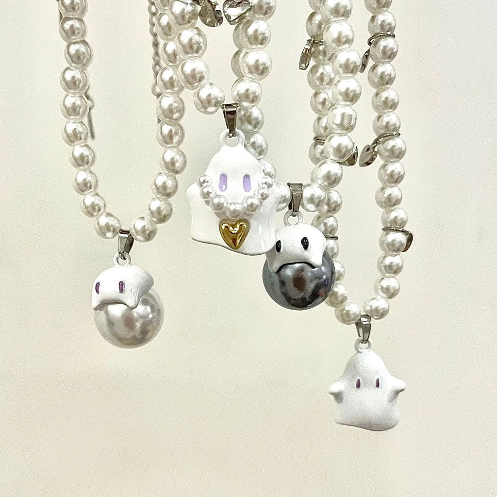 Add a touch of humor to your outfit with these funny cartoon ghost pendant necklaces. Featuring sweet heart charms and pearl beaded choker design, these accessories are perfect for girls looking for a playful Y2k style.