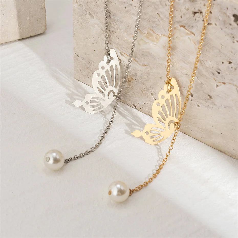 Efily Butterfly Pearl Bridal Backdrop Necklace