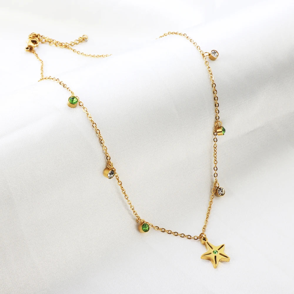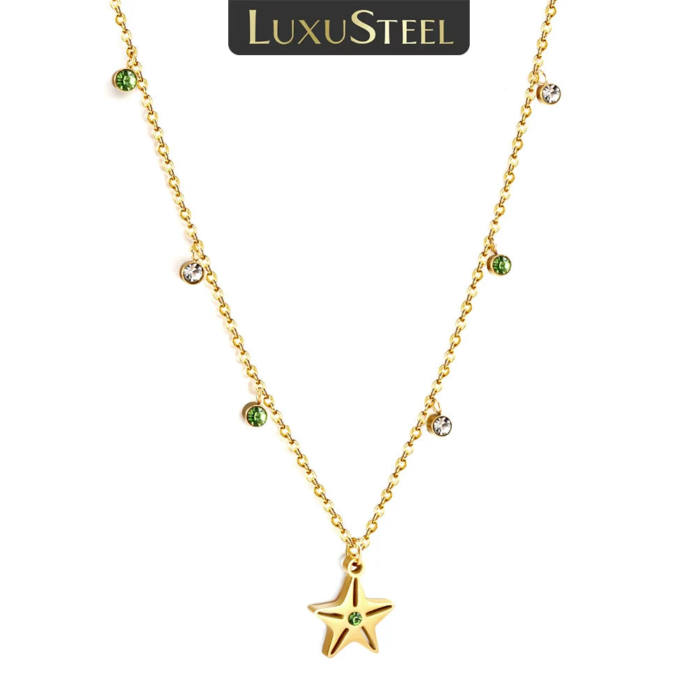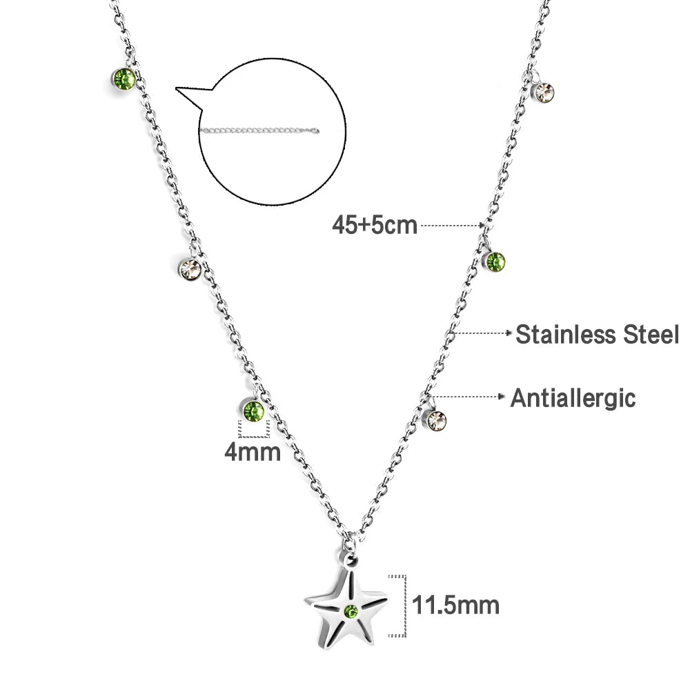 Add a touch of elegance to your outfit with this dainty green crystal stars pendant necklace. Made of stainless steel, it is both stylish and durable.