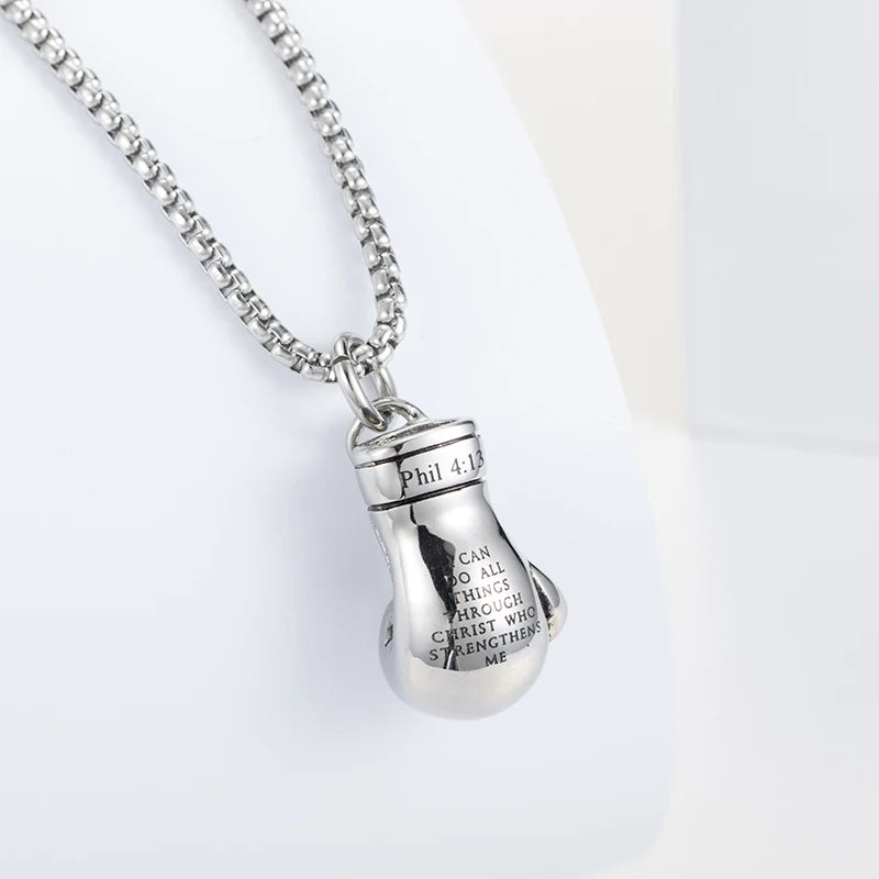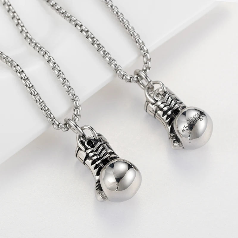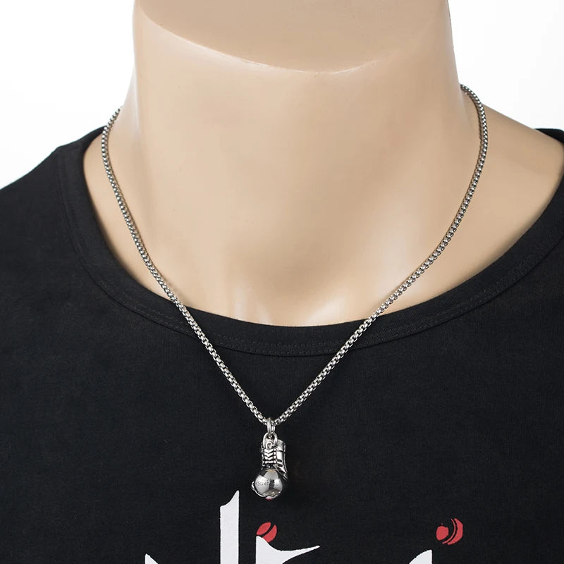 This stainless steel necklace features a boxing glove pendant, making it a perfect accessory for sport and fitness enthusiasts.