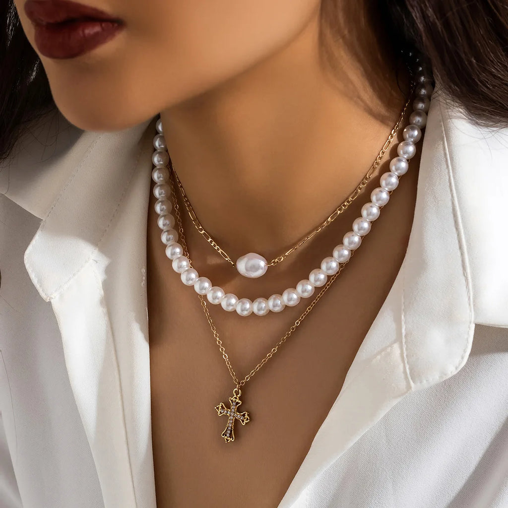 - Multilayer pearl necklace with geometric design