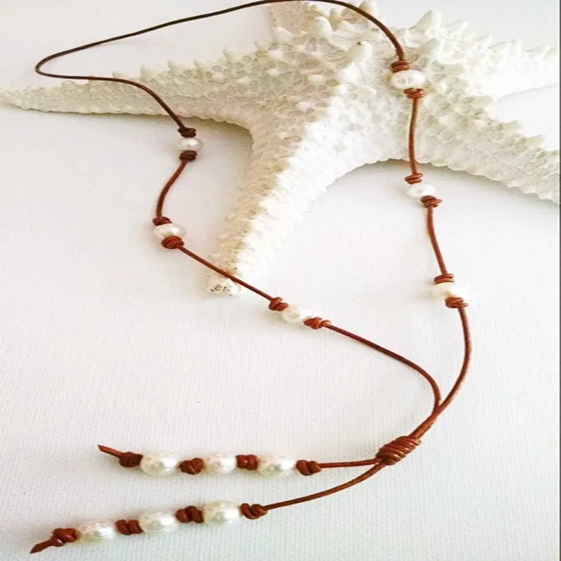 Elegant and timeless pearl necklace with leather knotting, perfect for Christmas or any special occasion.