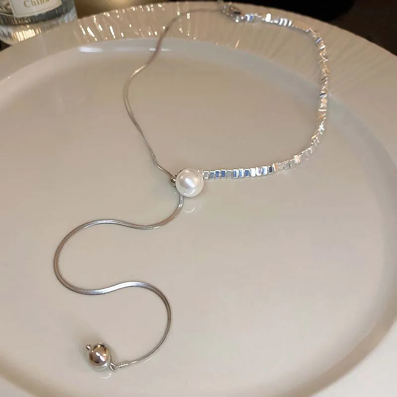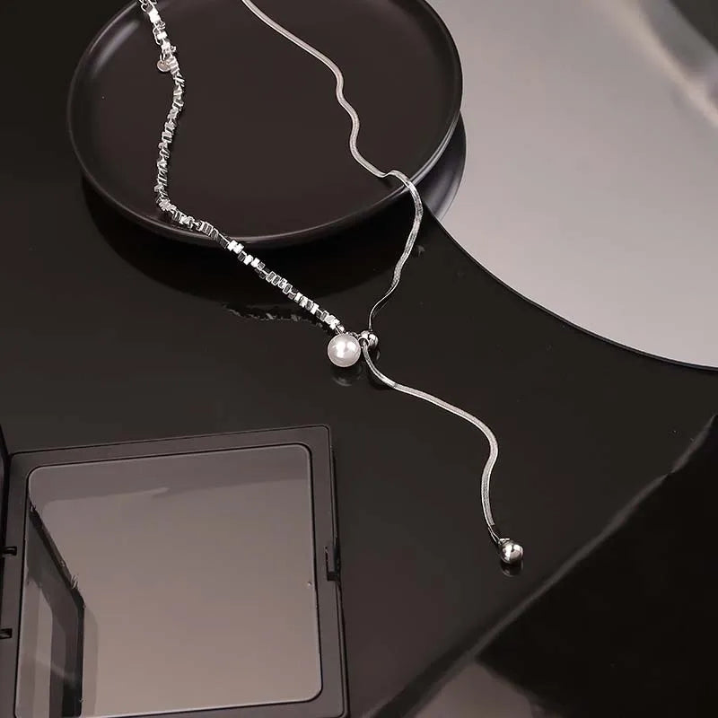 Silver Irregular Pearl Tassel Necklace Long Pulling Adjustable Clavicl