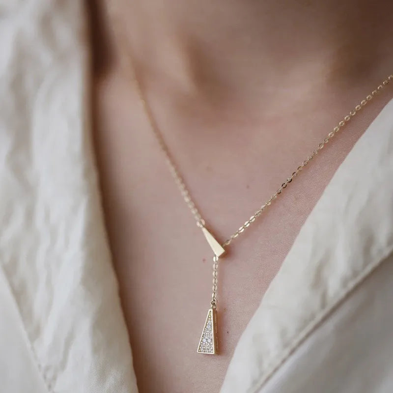 Elegant silver triangle Y shape pendant with zircon detailing. Perfect for adding charm to your outfit. Makes a great gift for a special lady.