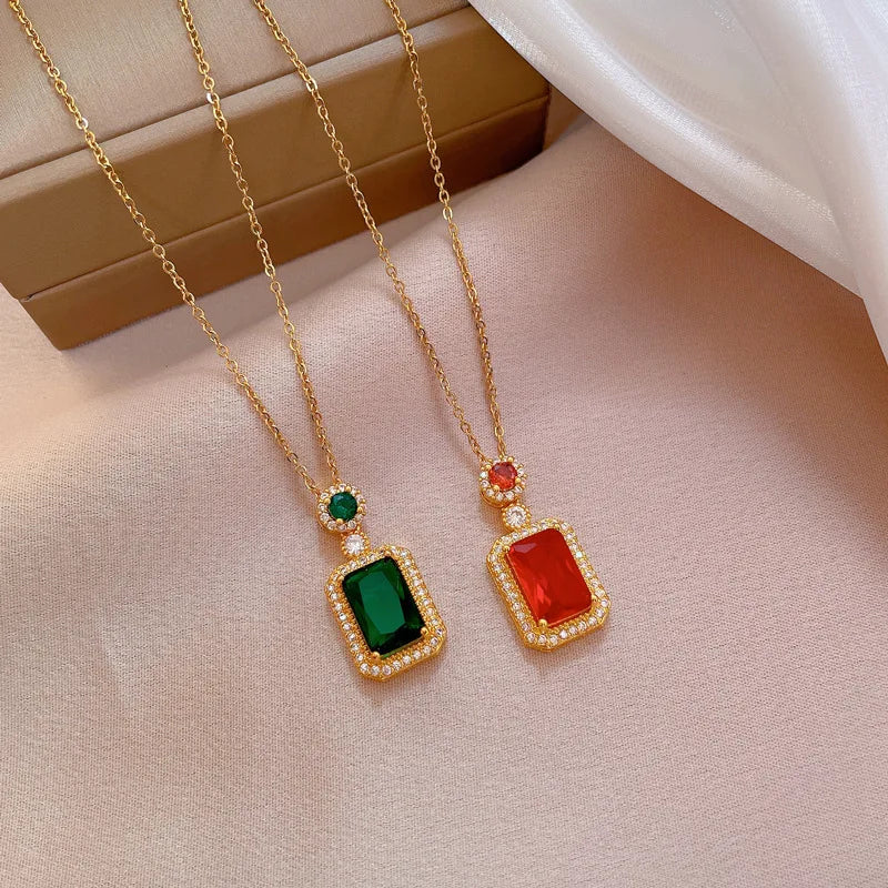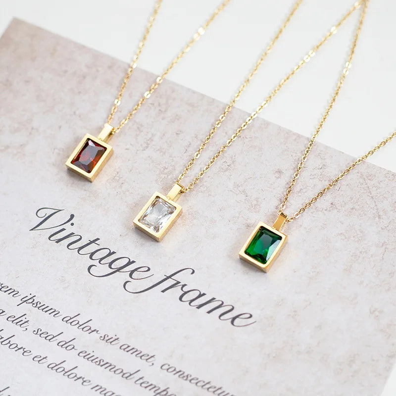 Stainless Steel Square Green Zircon Pendant Necklace for Women
