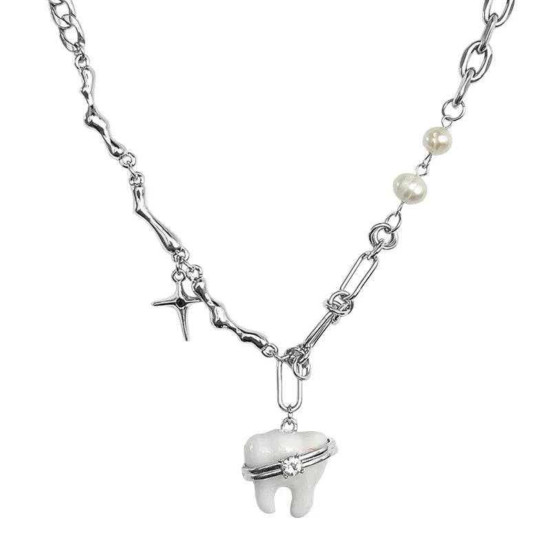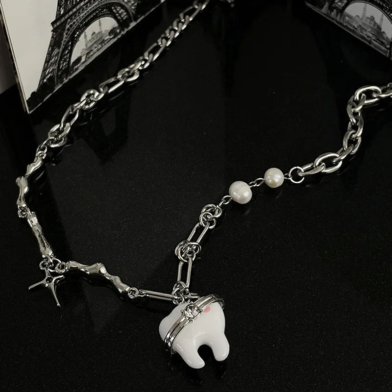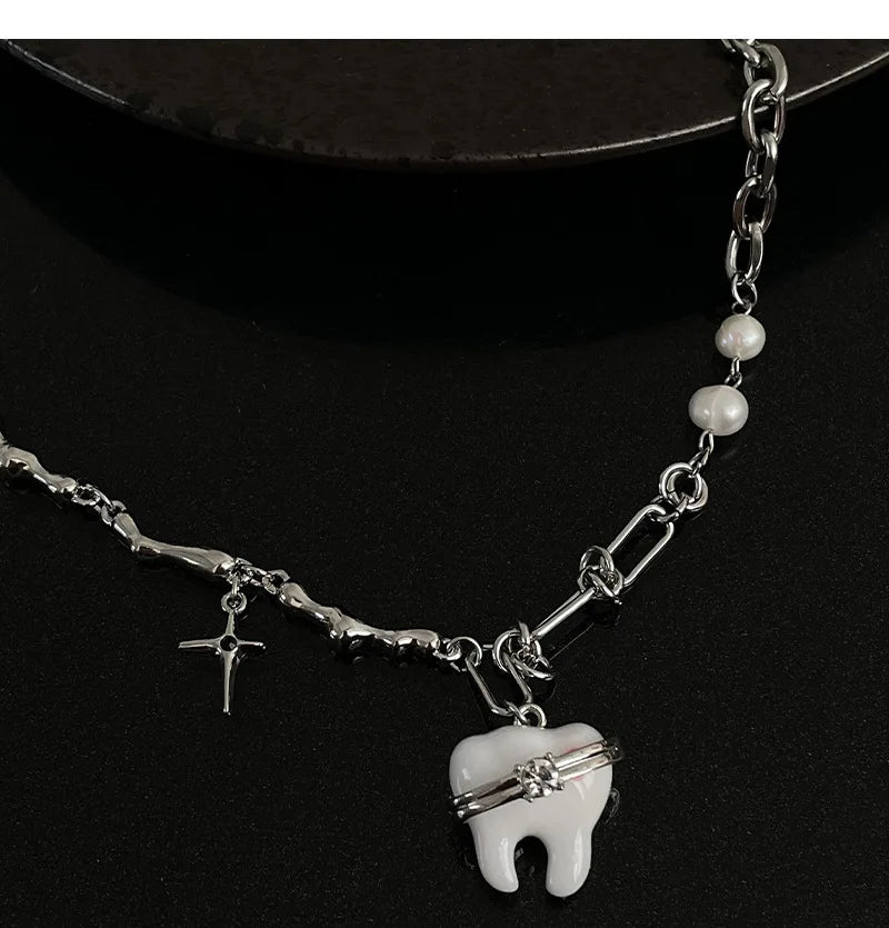 Add a touch of hip hop glam to your outfit with this unique necklace featuring sweet teeth pendant and pearl beads. Perfect for egirl or Harajuku style.