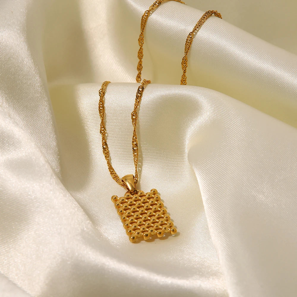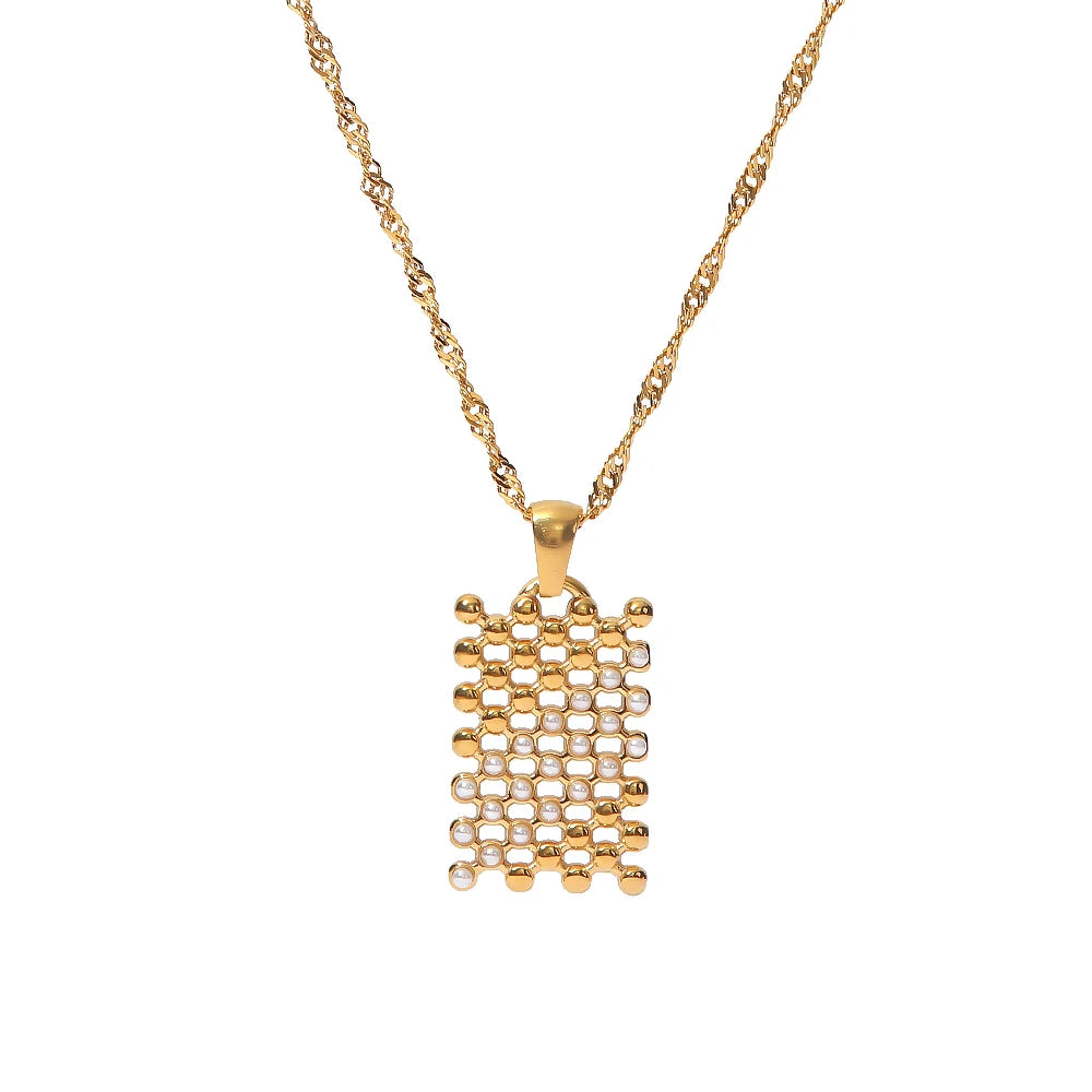 Stylish and elegant necklace featuring a mini pearl mesh rectangular pendant, crafted from stainless steel with 18K gold plating. Waterproof and durable design.