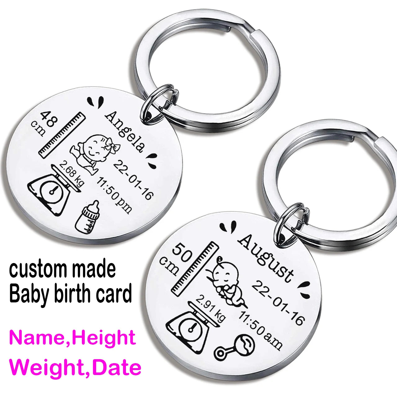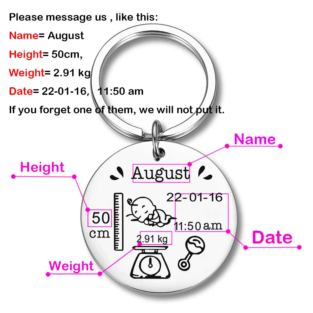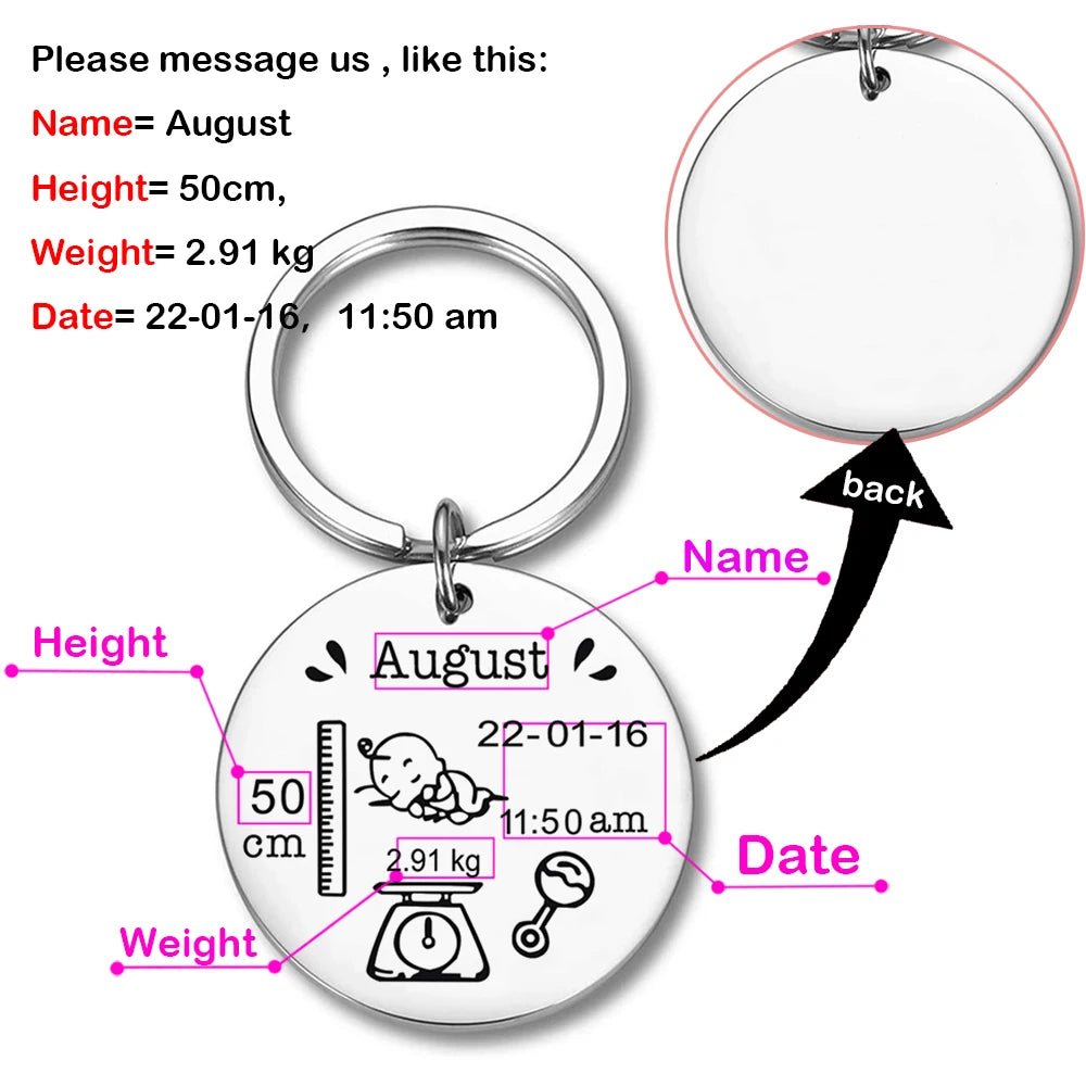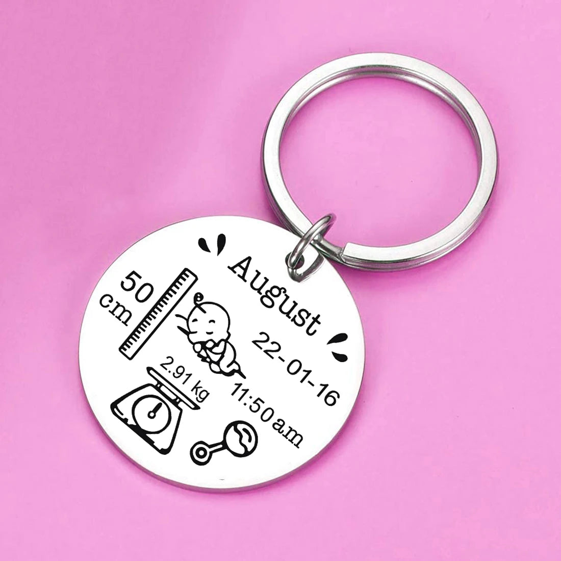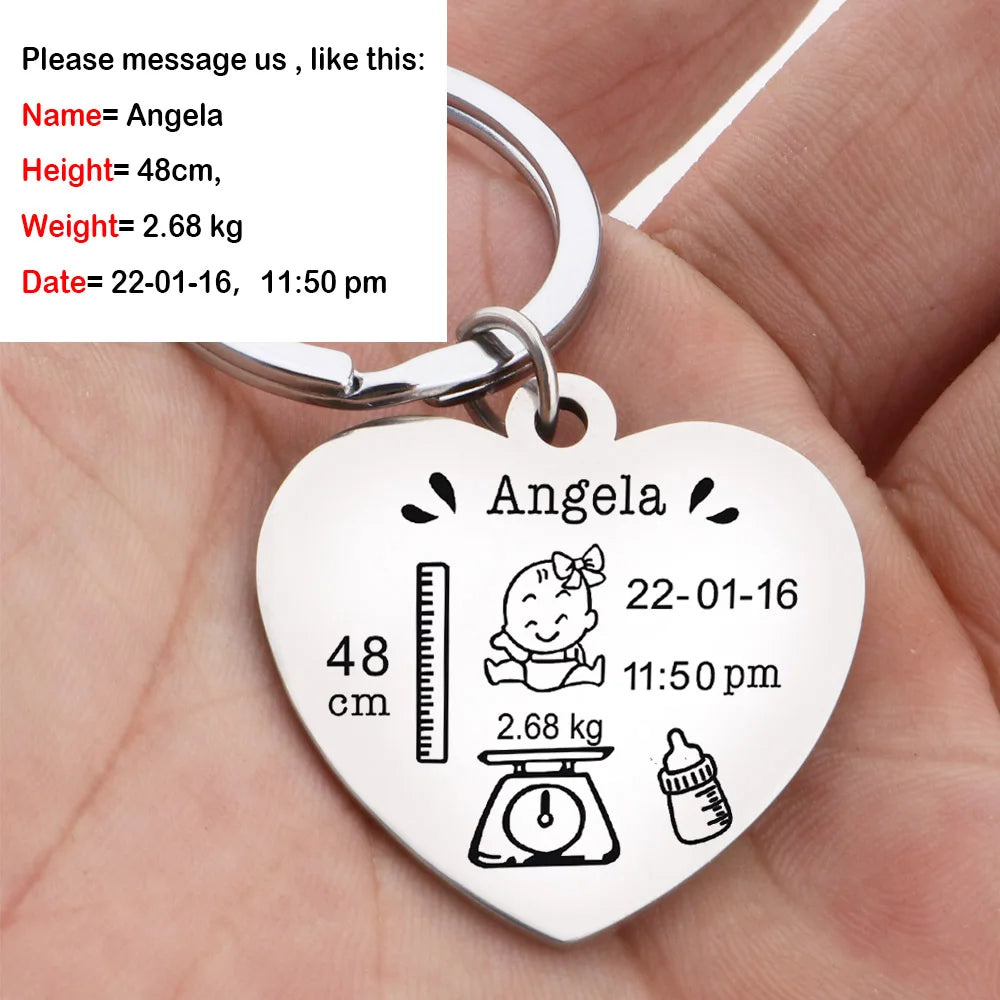 Keep your baby's birth information close with this stainless steel key chain featuring a heart-shaped pendant. A perfect souvenir to remember the special day and a thoughtful gift for new parents.