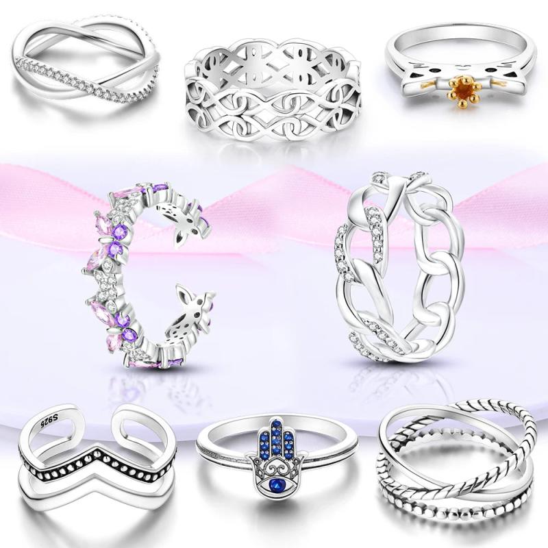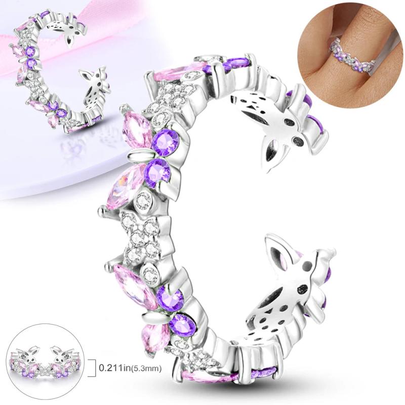 • 925 silver ring with butterfly, cat, zircon, and flower design